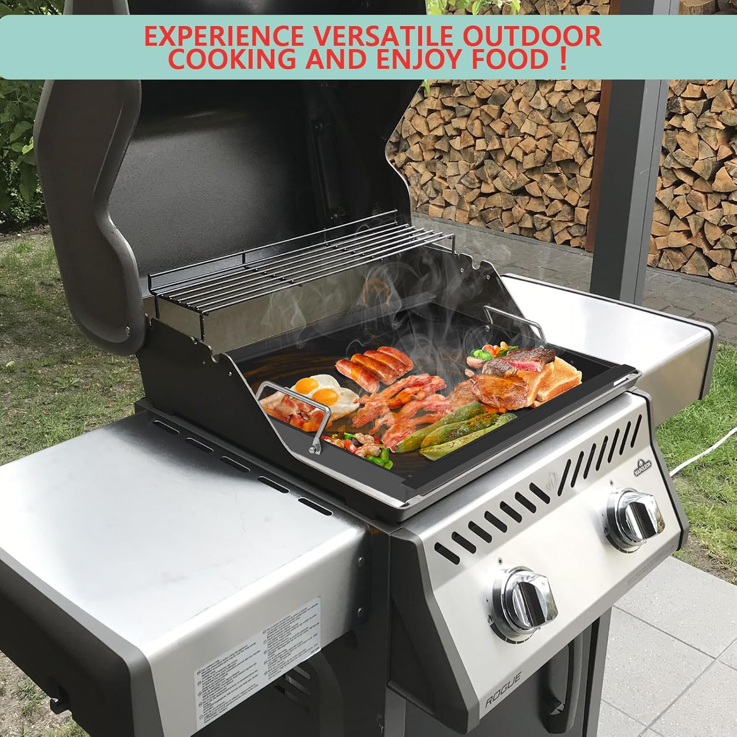 - Versatility: Experience versatile outdoor cooking and enjoy the benefits of a true flat griddle on your outdoor propane gas grill. A culinary powerhouse that revolutionizes your cooking experience both indoors and outdoors. perfect for sizzling crispy bacon, grilling juicy burgers and savory hot dogs, or even steaming and stir-frying multiple dishes simultaneously—no more waiting around for your meals!