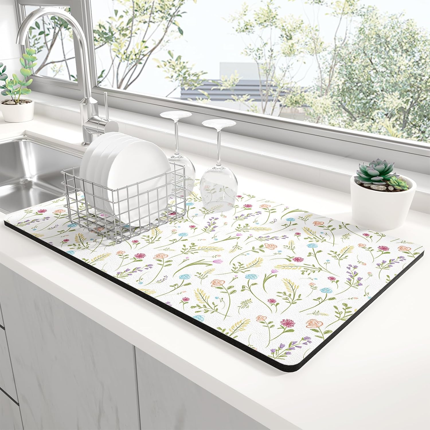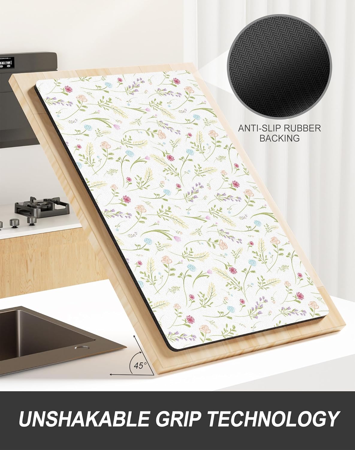 - Stylish Kitchen Upgrade:Cute dish drying mat with boho, floral, or marble designs elevates any kitchen style. Vibrant fade-resistant colors complement farmhouse/modern kitchens.This stylish kitchen decor keeps kitchen counter dry while adding a chic touch