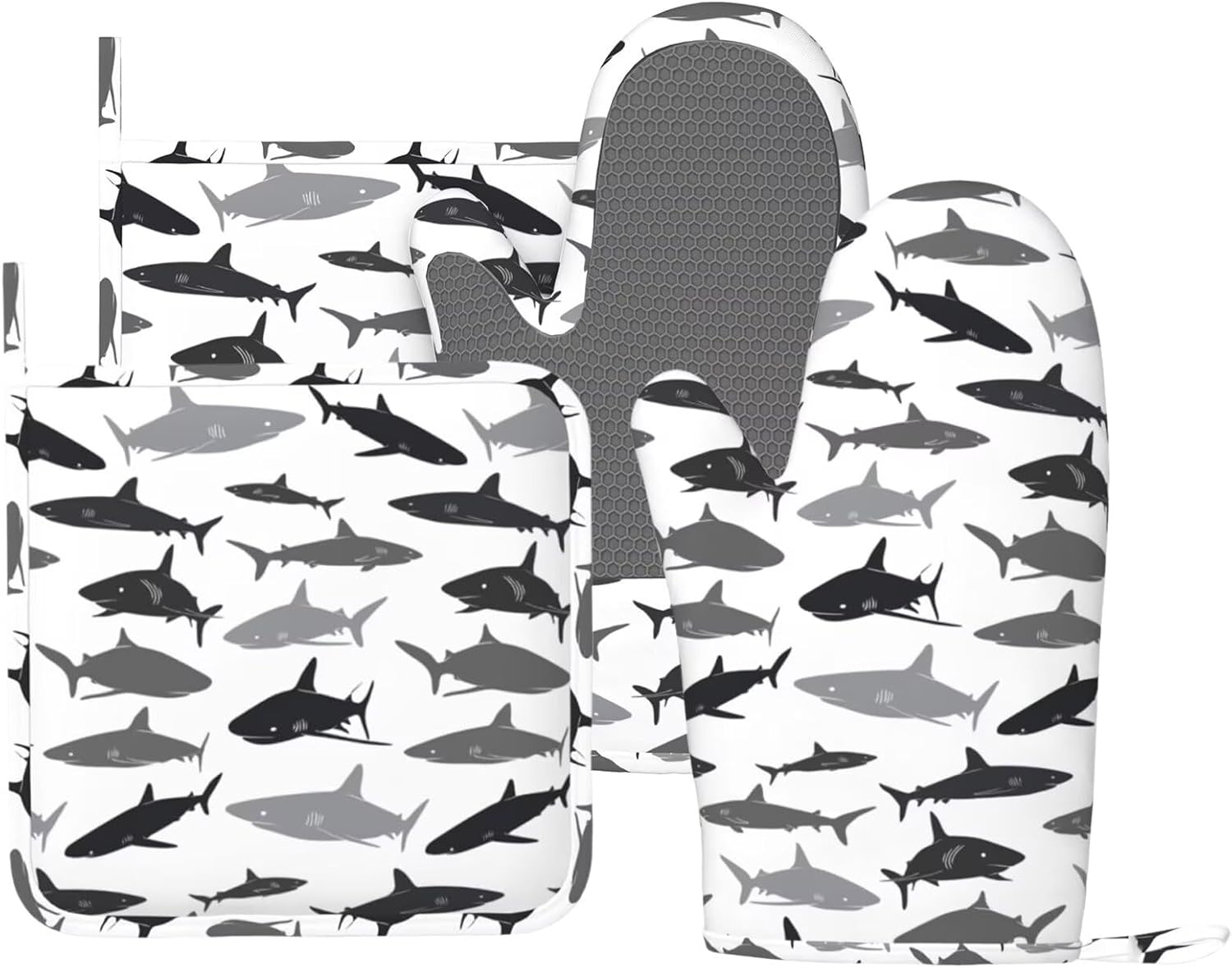 Sharks Oven Mitts and Pot Holders Set of 4 Silicone Sea Animal Kitchen Mitten Gloves and Non-Slip Shark Potholders Set Heat Resistant Oven Gloves Hot Holders for Kitchen