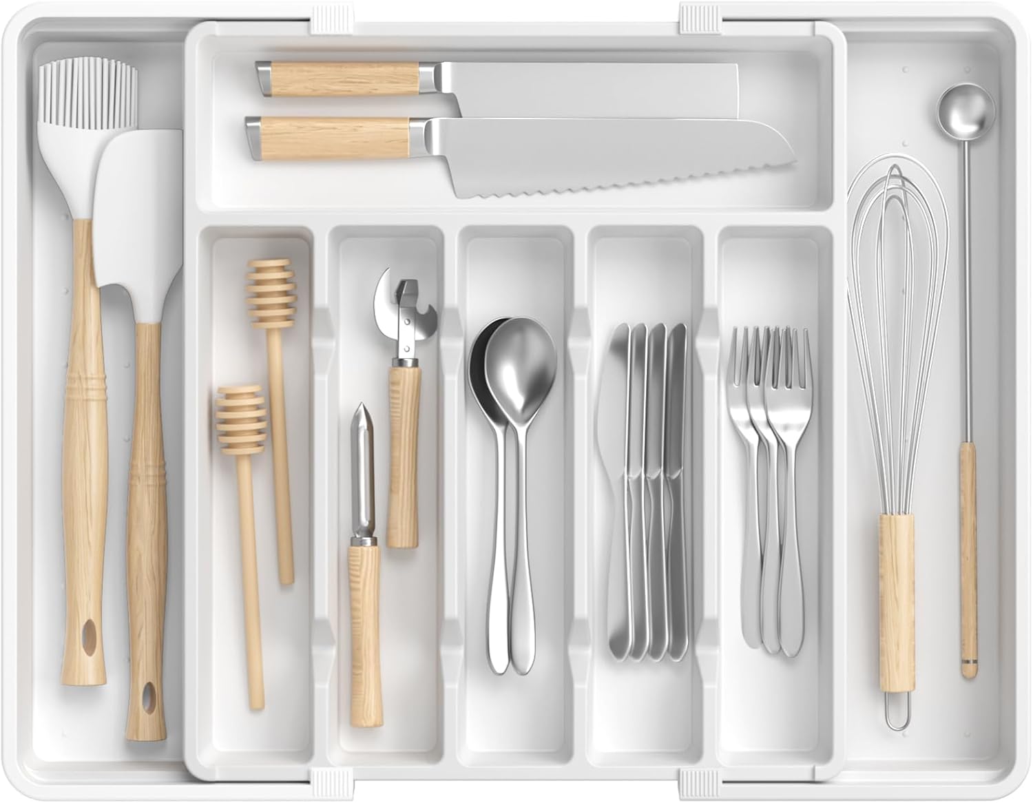 Large Silverware Organizer,Expandable Utensil Drawer Organizer,BPA Free Utensil Holder,Adjustable Silverware Tray Cutlery Drawer Organizer for Kitchen Flatware,Large,White (6-8 Slots)