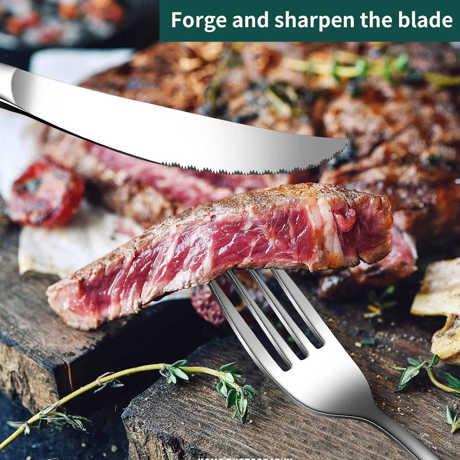 - Steak Knives Included: No need for a separate set! Our 4 precision-forged steak knives feature tightly spaced serrated edges for effortless meat cutting. Dine with confidence – the razor-sharp blades handle tough cuts smoothly, letting you focus on savoring every bite