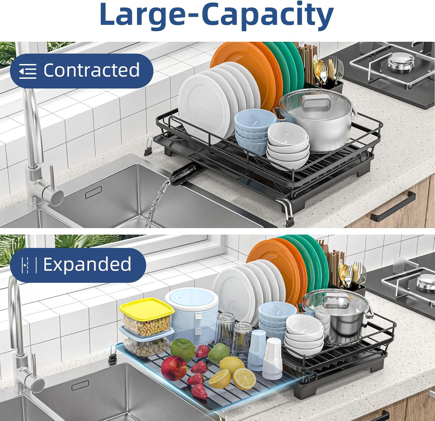 - Large-capacity expandable design: ULAIHOMN dish drying rack has a large capacity and is equipped with a retractable drying rack that can be installed above the sink. When pulled out, the extended part will increase the length to 21 inches, almost doubling the storage capacity. It is spacious enough to accommodate 10 plates, 12 bowls, 6 glasses, 2 cups, 1 pot and tableware, which helps keep the kitchen tidy and orderly.
