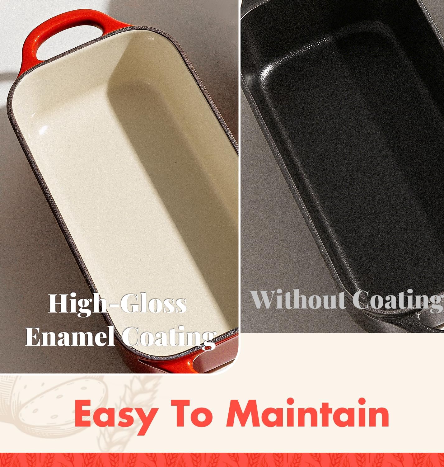 - 【Premium Loaf Pan】Made from high-quality cast iron, classic red enamel coating, our bread oven is built to last. Oven Safe up to 500°F, no need to worry about deformation or harmful coating peeling off. Our dutch oven pan is suitable for all cooktops, including induction, oven and broil