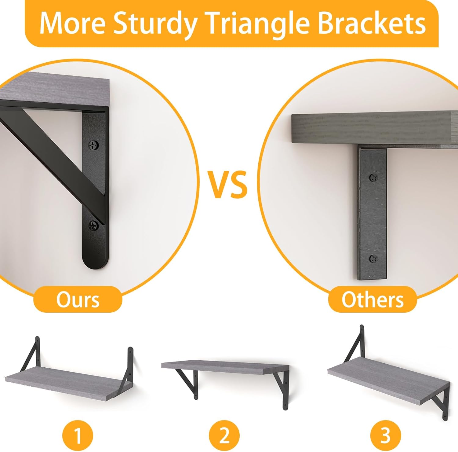 - ăSturdy & Easy to AssembleăThe Triangle shaped metal brackets are more sturdy, with a capacity of 40Lb. YGEOMER wood floating wall shelves for bathroom are super sturdy, very easy to install, all hardware and user manual was included.