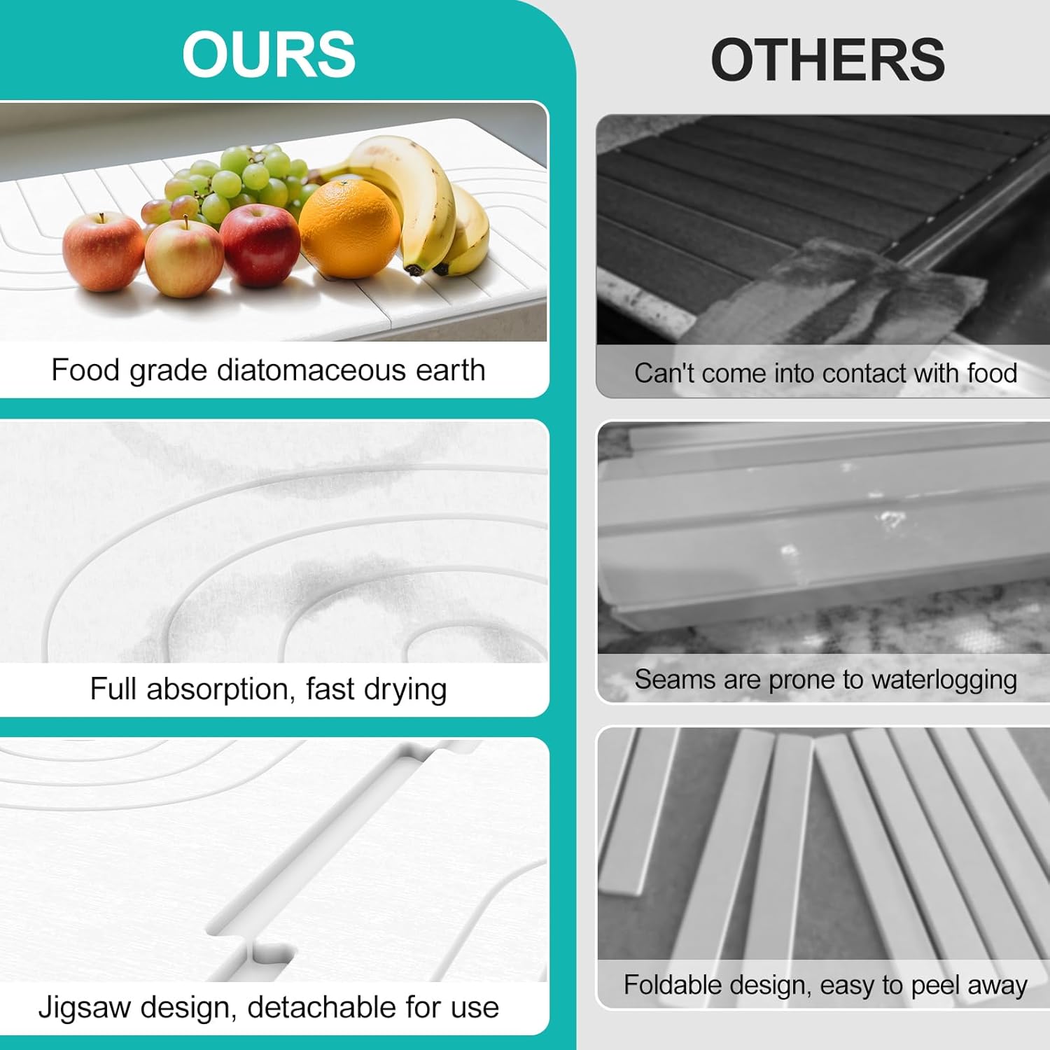 - Jigsaw Design: The dish drying mats for kitchen and bath counter can be freely assembled or disassembled like a jigsaw puzzle. The bath stone mat can be used individually or in combination, flexible to adapt to various scenarios. The assembled kitchen drying mat measures 24.02×15.75×0.31 in/61×40×0.8 cm and is half the size of the original when disassembled.