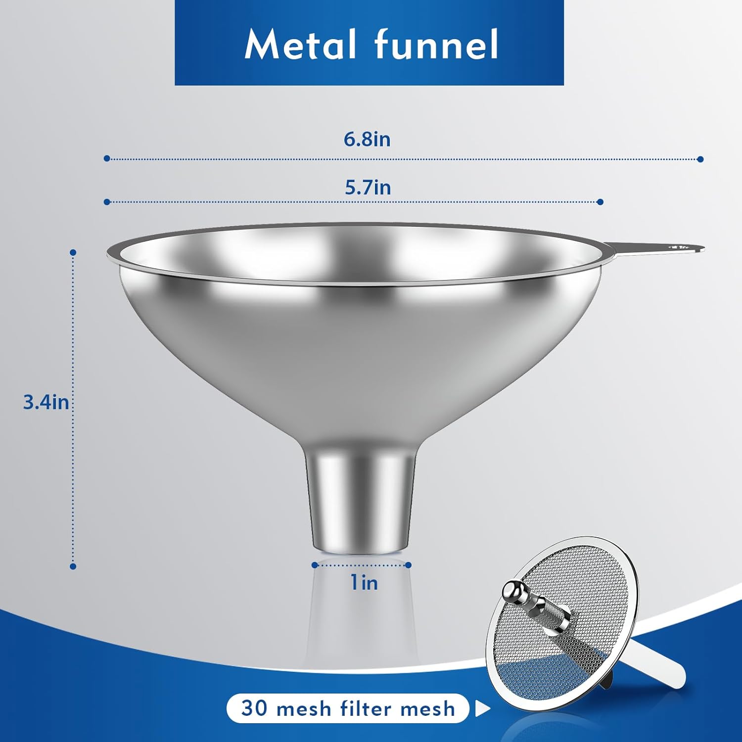 Stainless Steel Funnel (5.7 in. x 1 in. Mouth) with 30 Mesh Removable Stainless Steel Filter, Food Grade Metal Large Funnel for Kitchen, Liquids, Oils, Powders, Spices, Home Brewing.