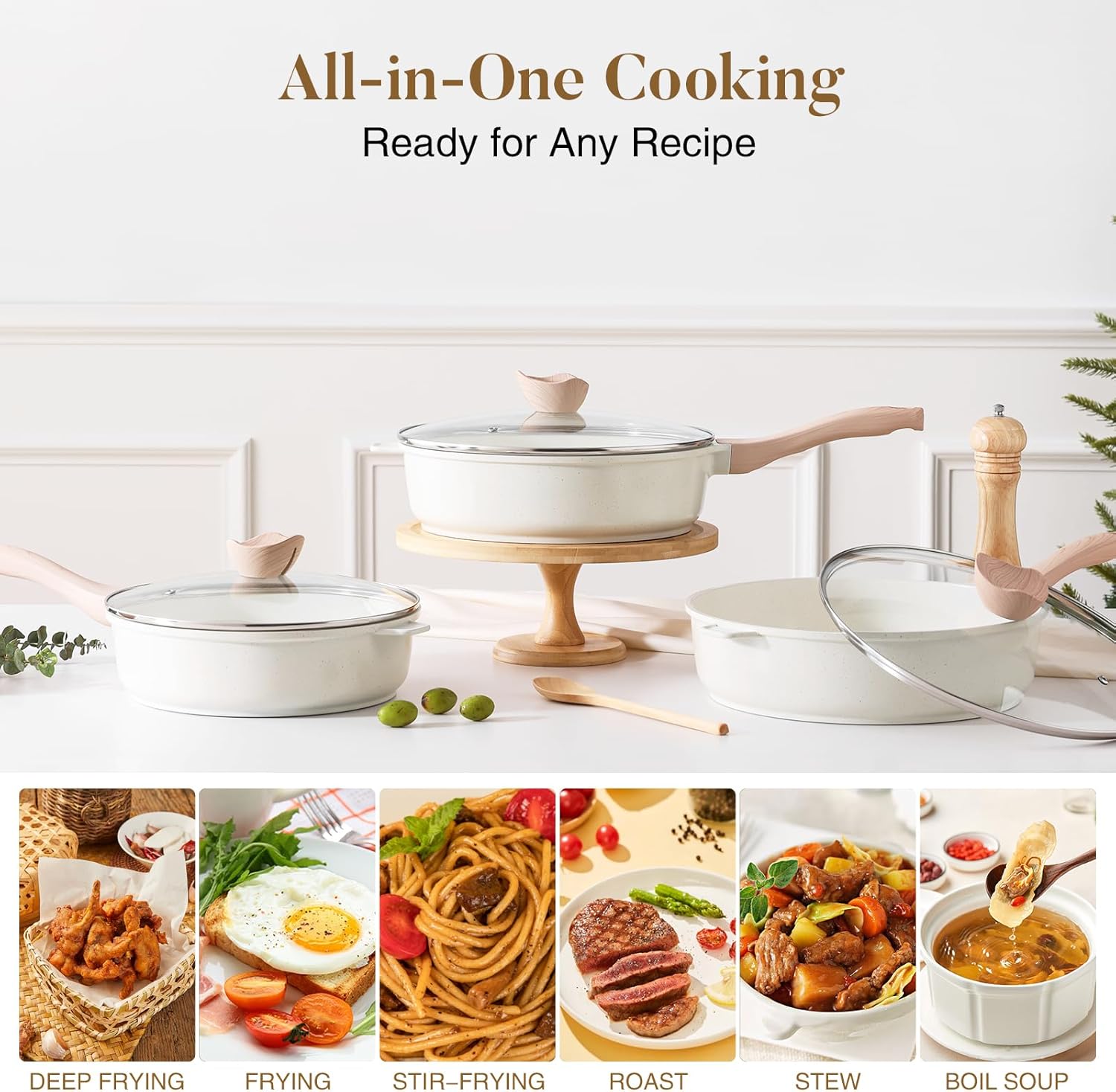 - 【Versatile Saute Pan with Lid】: Experience the convenience of our 12" diameter, 3.2" height, and 5 quarts capacity ceramic cookware; this large and deep skillet, also functioning as a deep frying pan and induction frying pan, is perfect for stir-frying, frying, boiling and deep-frying a variety of dishes with ease