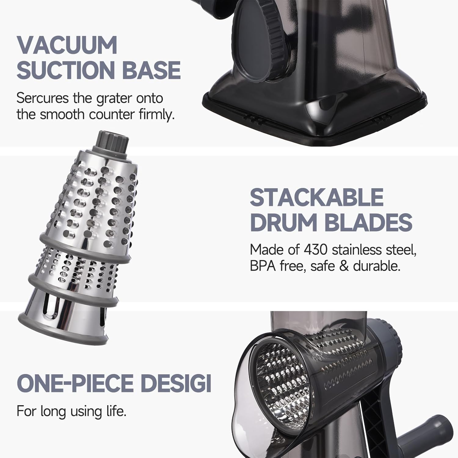 - 【Grater for Kitchen】: 【3-IN-1 cheese shredder】With 3 drum blades for slicing,shredding,and grinding various ingredients;Perfect for cheese, carrots,cucumbers,potatoes,broccoli, chocolate,salads and pizza toppings;Use slicing/coarse for soft cheese,fine for hard cheese.