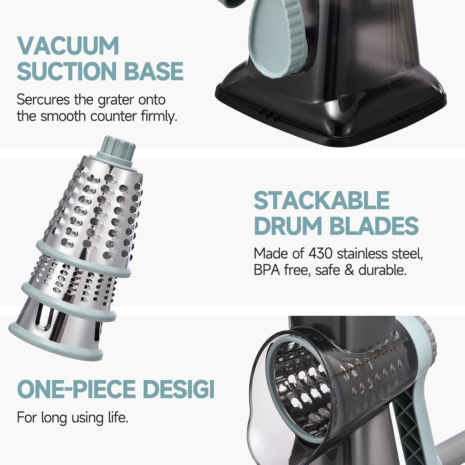 - 【Grater for Kitchen】: 【3-IN-1 cheese shredder】With 3 drum blades for slicing,shredding,and grinding various ingredients;Perfect for cheese, carrots,cucumbers,potatoes,broccoli, chocolate,salads and pizza toppings;Use slicing/coarse for soft cheese,fine for hard cheese.