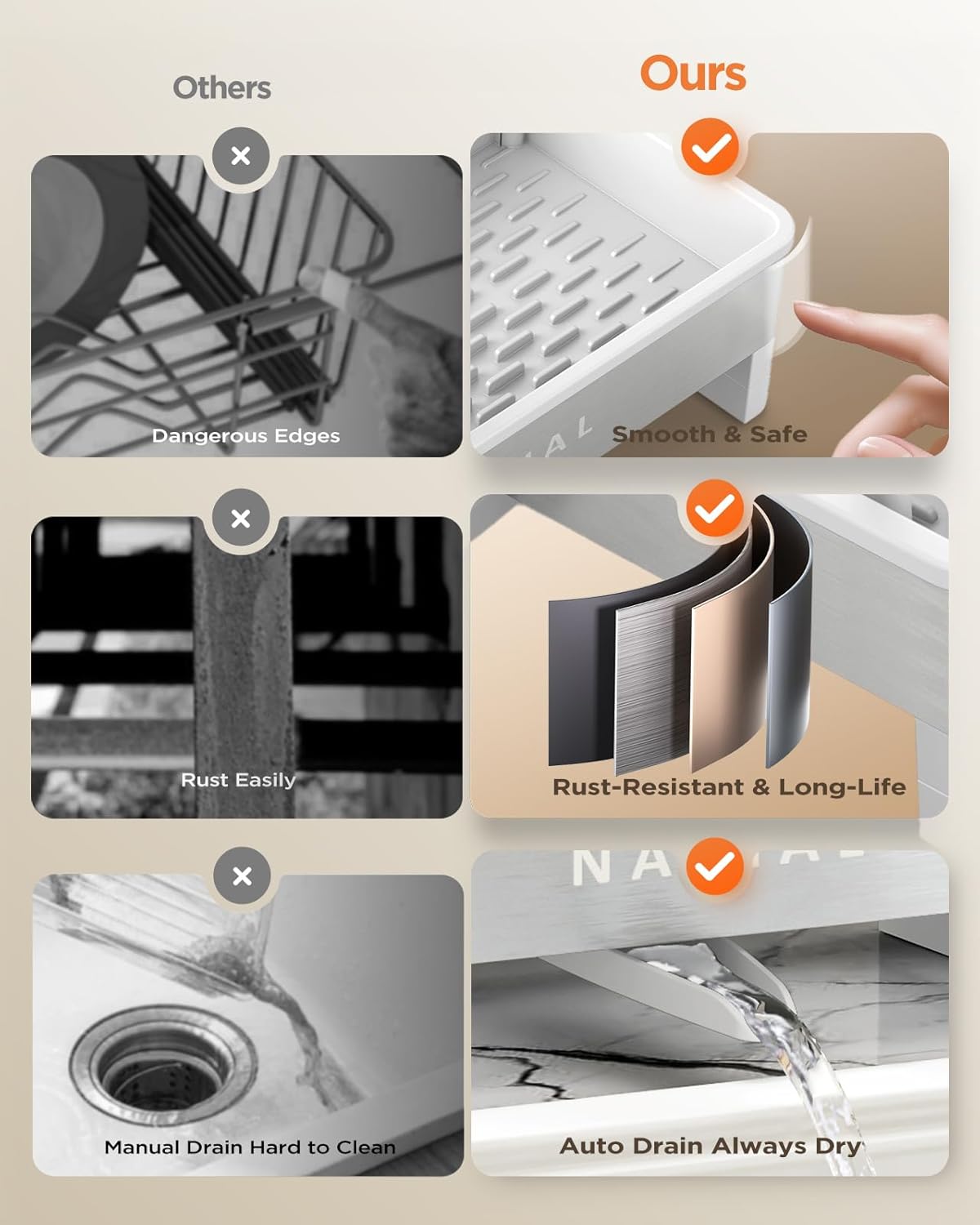 - Adjustable Height, Perfect Fit: Nacial sink sponge holder features a detachable base with customizable height, adapting to any sink. Unlike conventional sponge holders posing cut risks, Nacial enforces precision-rounded guards that eliminate injuries.Critically, while other organizers trap moisture leading to rust, Nacial 304 stainless steel & auto-drain desgin ensures lasting dryness through rapid drainage. Get your Nacial, Your indispensable kitchen essential