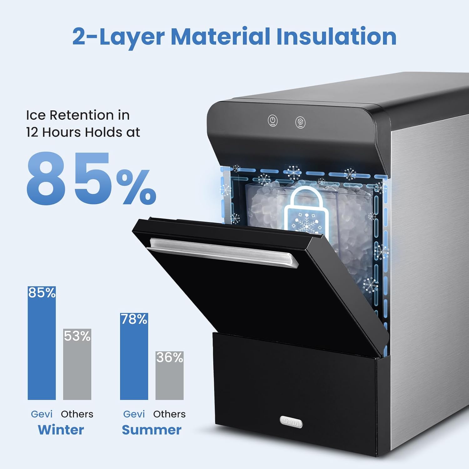 - ๐๐จ๐ฎ๐๐ฅ๐ ๐๐๐ฒ๐๐ซ ๐๐๐ญ๐๐ซ๐ข๐๐ฅ ๐๐ง๐ฌ๐ฎ๐ฅ๐๐ญ๐ข๐จ๐ง-Gevi ice maker features advanced 2-layer material insulation that effectively retains ice for up to 12 hours, maintaining up to 85% of its original temperature. This superior insulation ensures your ice stays colder, longer, even in warmer environments.