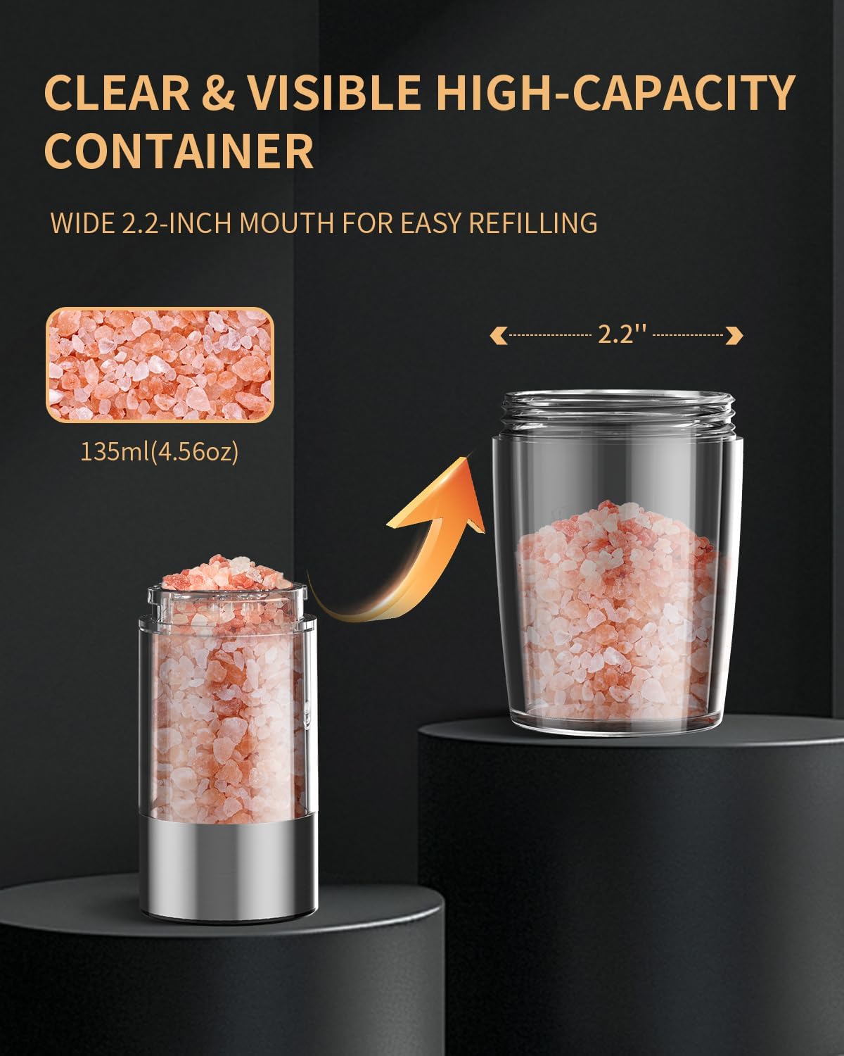 - 【LARGE CAPACITY & VISUALIZATION】: The electric pepper and salt dispenser is made of BPA-free acrylic material with 2.2" wide mouth that allows you to easily add a variety of seasonings.The large 135ml transparent filler bin holds and differentiates between a wide range of spices, with the remaining amount clearly visible. The white LED light is not only aesthetically pleasing, but also helps you know how much seasoning is in your food, making it easy to control the balance of your seasoning