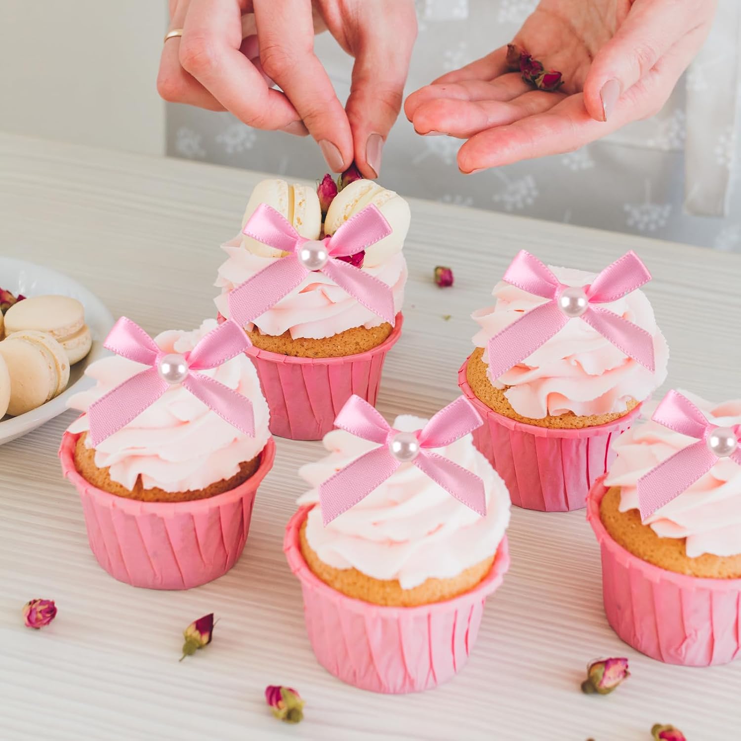 12 Pcs Mini Pink Pearl Bow Cake Toppers Pearl Bows Cake Decorations Ribbon Bowknot Birthday Cupcake Topper Pearls Bow Knot Ornament for Bachelorette Birthday Engagement Wedding Party Supplies