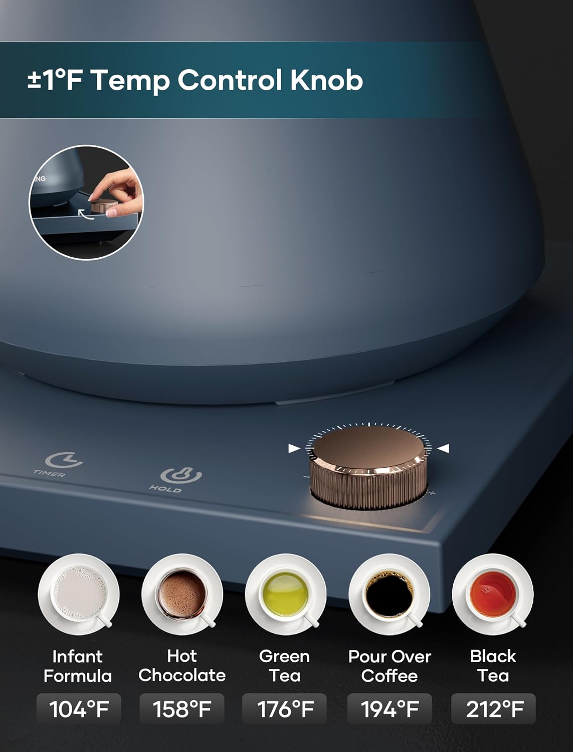 - ±1℉ Temperature Accuracy - The intelligent base's built-in temperature control program. The program will adjust the heating power when the water temp approaches the desired temp according the temp probe detects the temp change.