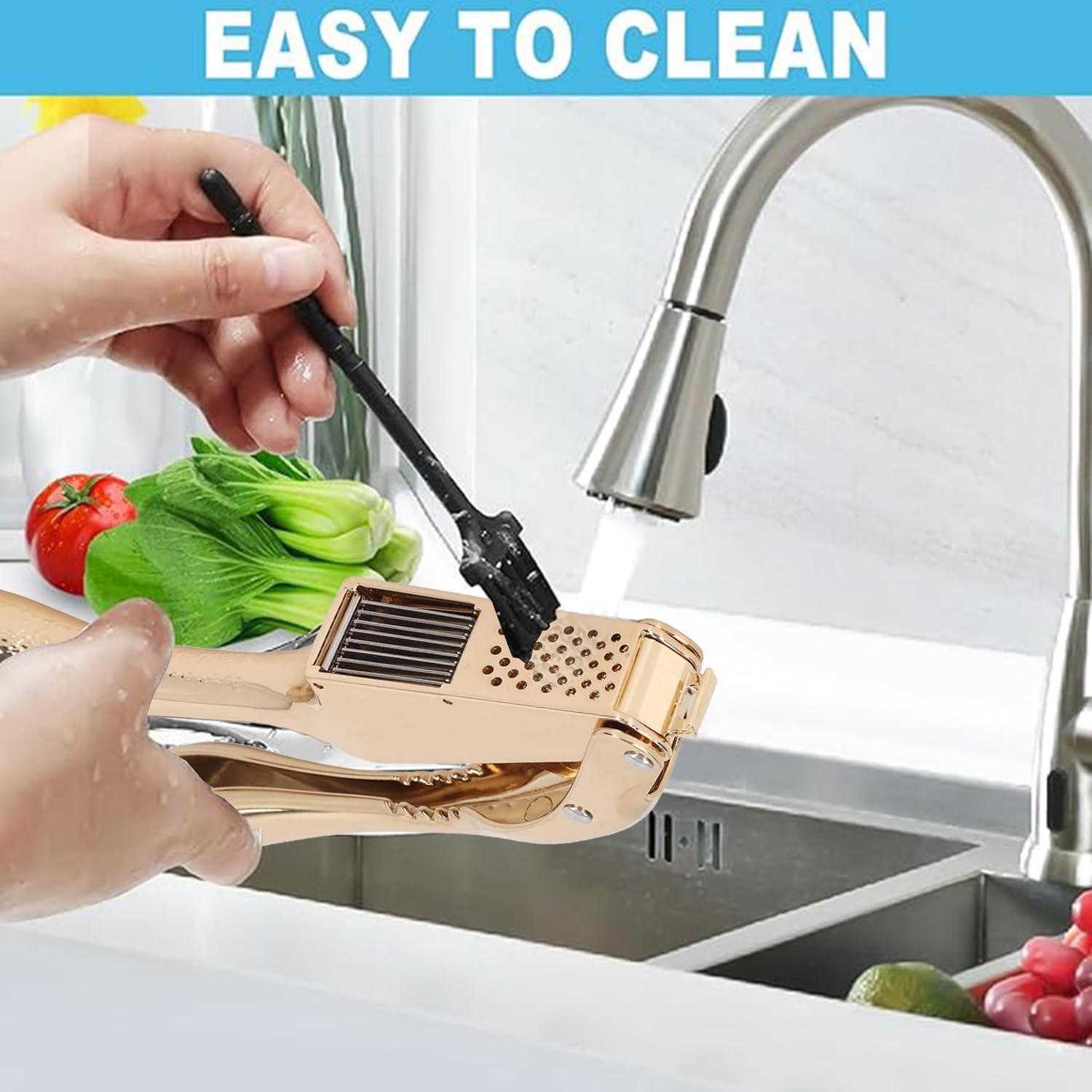 Garlic Press and Slicer 2 in 1, Rust Proof & Dishwasher Safe Professional Garlic Mincer Tool, Effortlessly Crush and Mince Garlic with this Ergonomic Handle-Garlic Peeler & Brush ANCQMI(Gold)