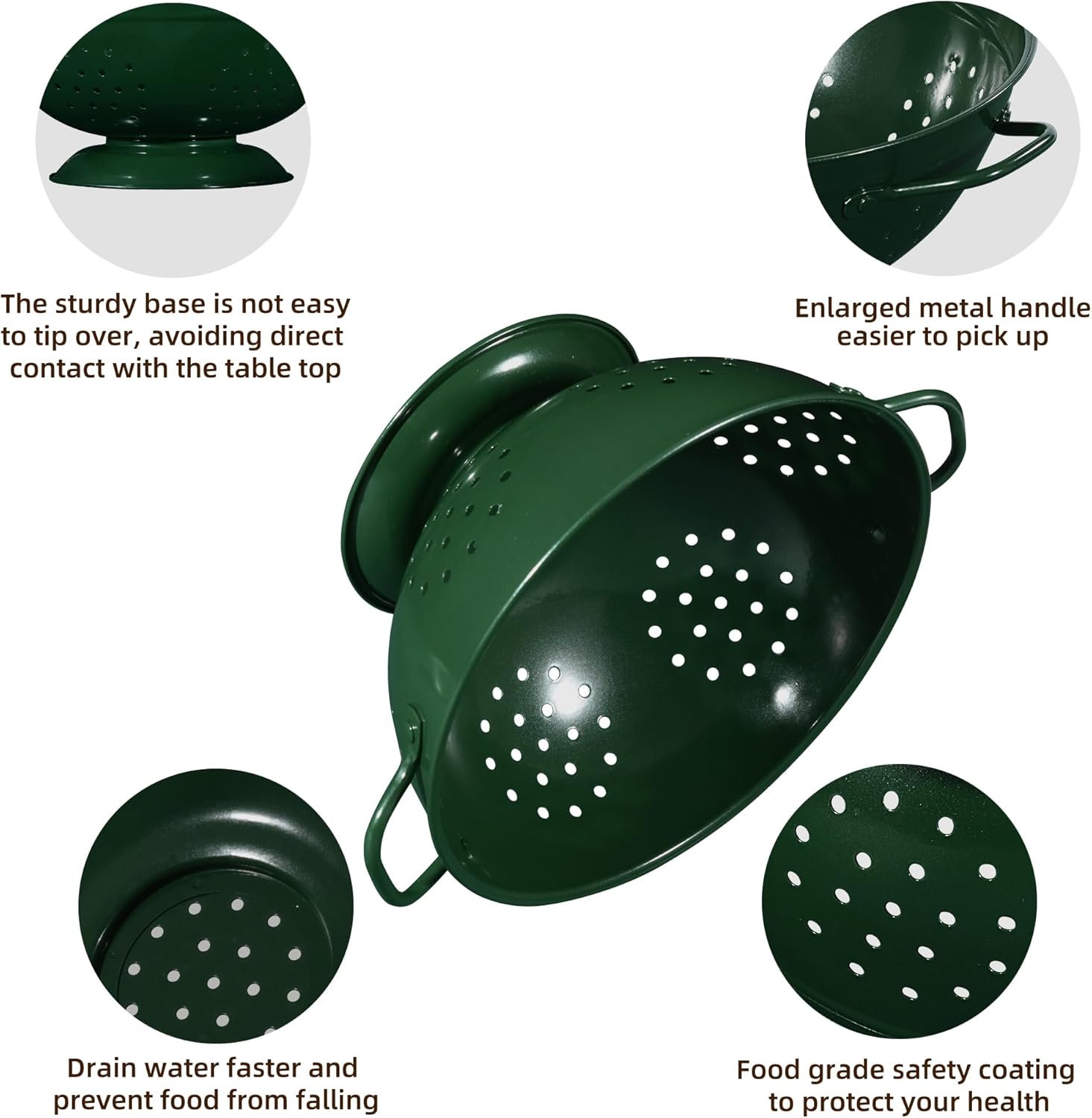 Metal Colander Set of 3, Strainer Basket with Handles perfect for Spaghetti, Pasta, Berry, Vegetable, Fruit, Solid Base Powder Coated Kitchen Essential Strainer Set, 1 & 3.5 & 5 Qt (Dark Green)