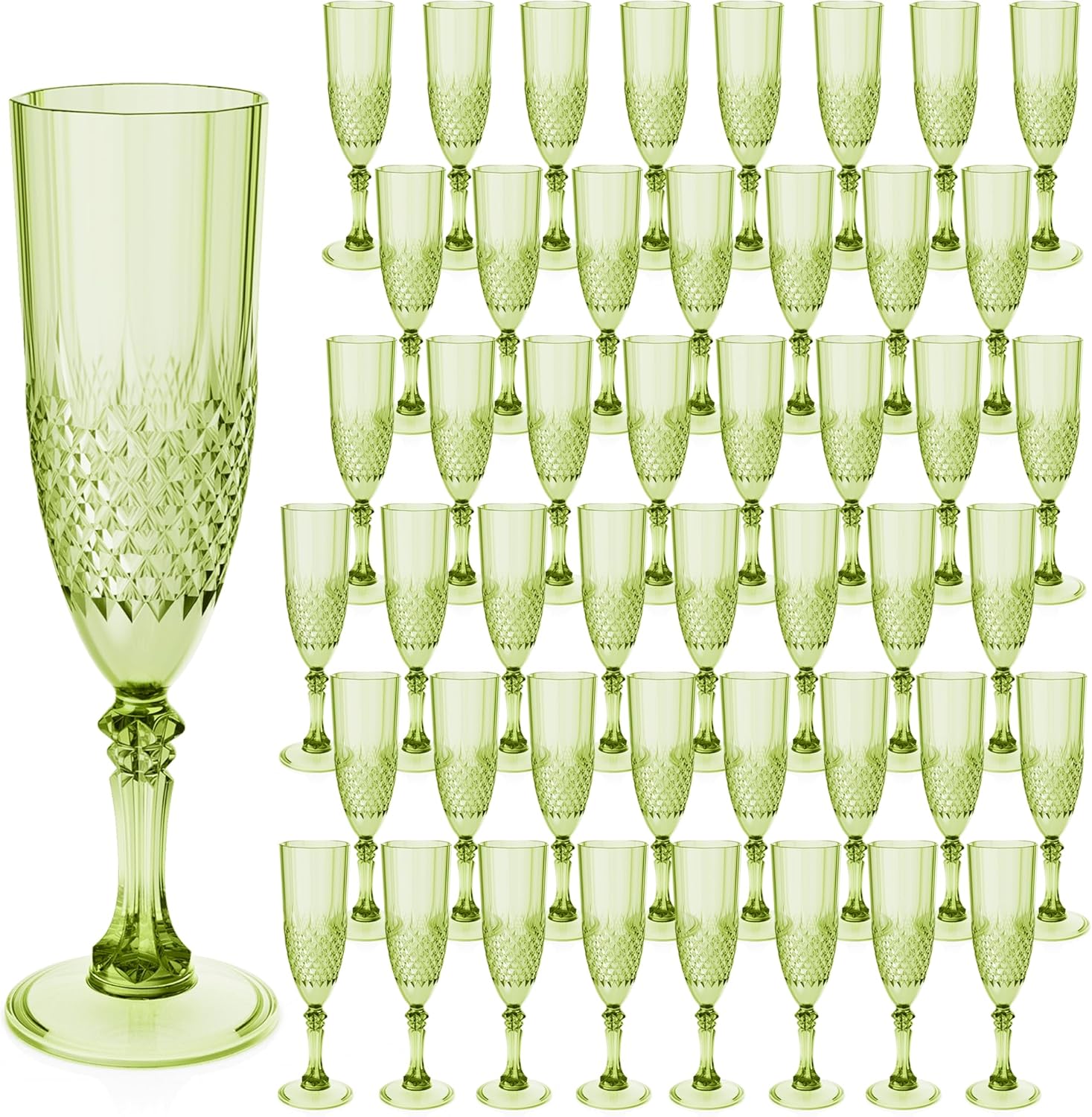- Charming Set: Champagne flutes set include 48 retro-style green champagne plastic wine glasses, providing ample quantity to meet your daily use and replacement needs. A suitable champagne cup is the icing on the cake. Plastic wine glasses not only carry the wine, but also carries the laughter and blessings
