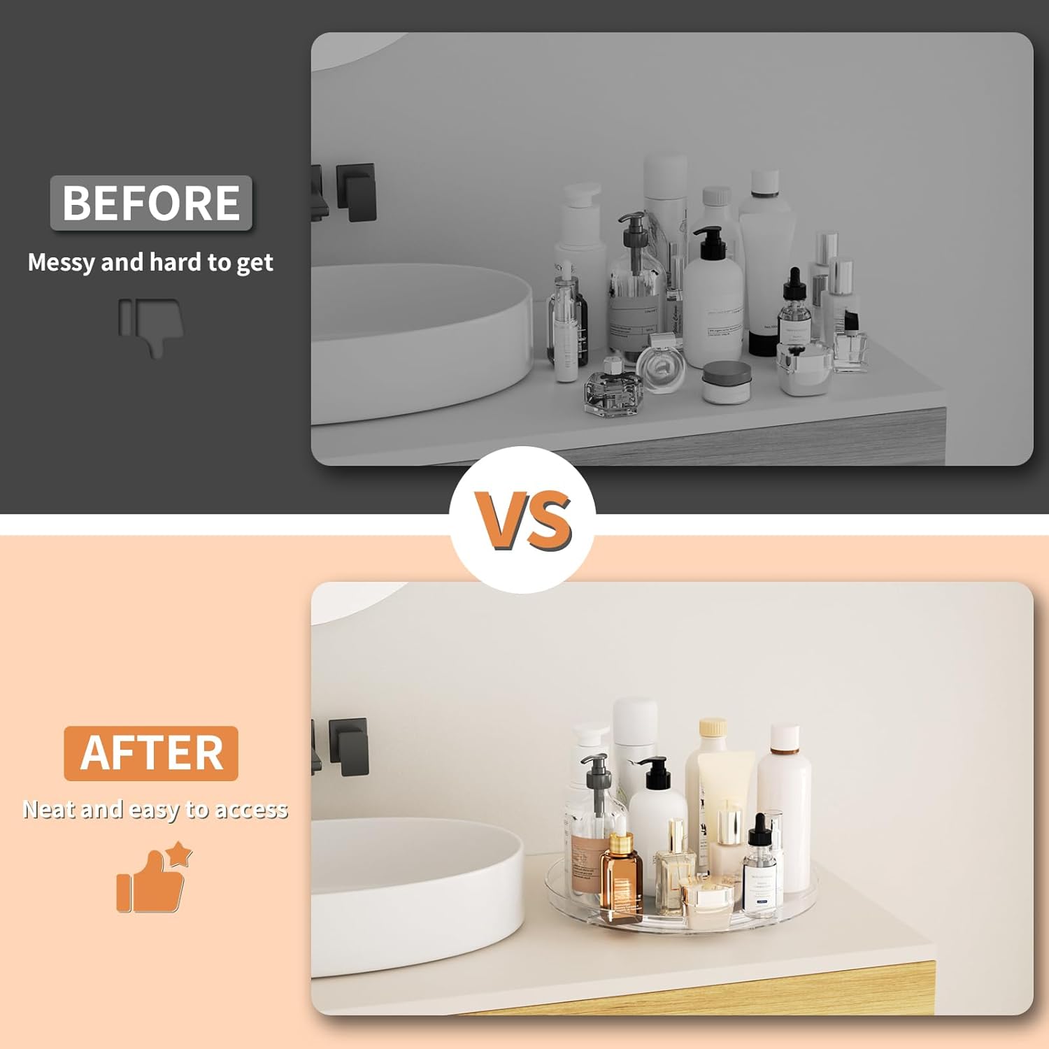 - Multiple Use: Suitable for kitchen seasoning storage, toiletries organization, limited cabinet storage, fridge drinks placement, etc. The turntable organizer is clear at a glance, making it easy to find the required items quickly
