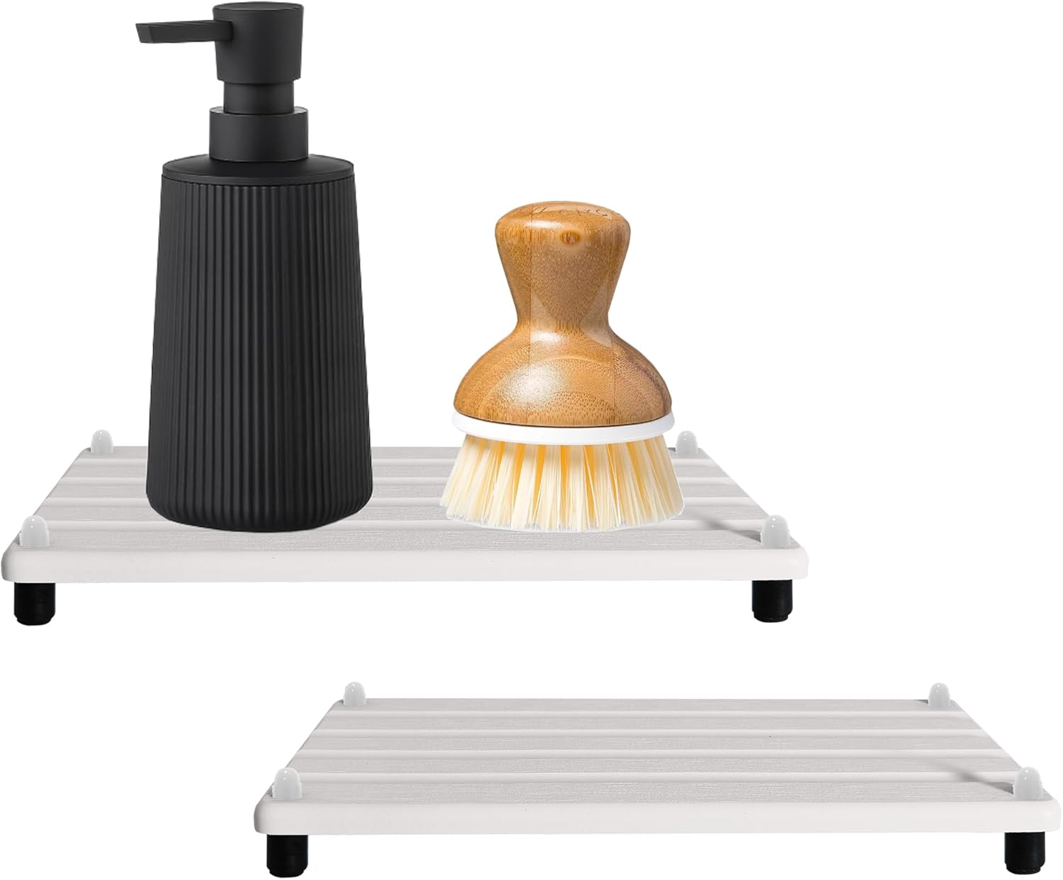 2 PCS Water Absorbing Stone Trays for Bathroom Counter, Fast-Drying Faucet Mat for Kitchen Sink, Diatomite Sink Caddy, Hand Soap Holder with Anti-Skid Feet (9.5" x 4.7" White)