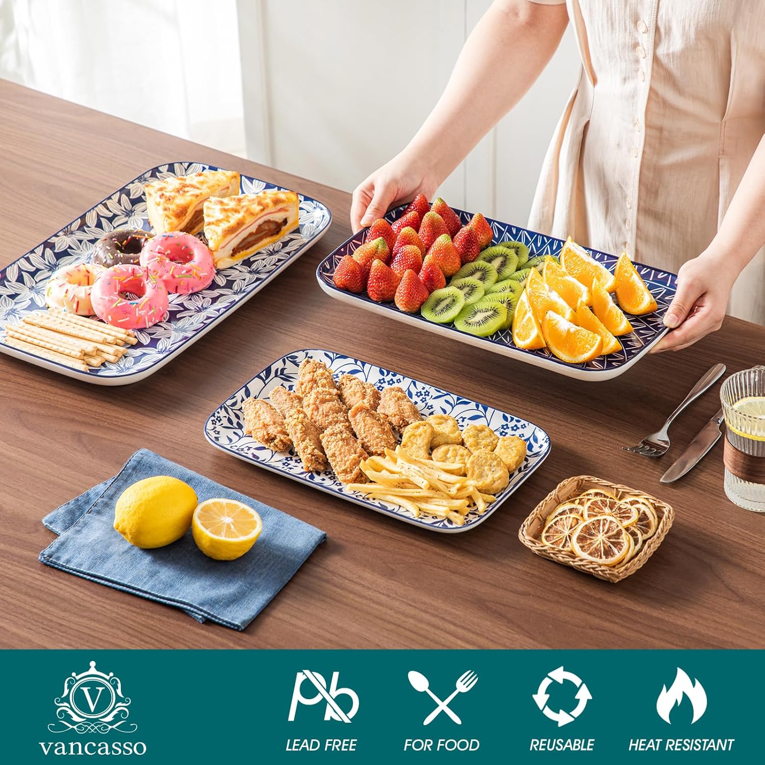vancasso Serving Platters Set of 3, 16"/14"/12" Inch Rectangular Trays - Serving Platter Extra Large, Ceramic Serving Dish Microwave & Dishwasher Safe (Vintage Blue A)