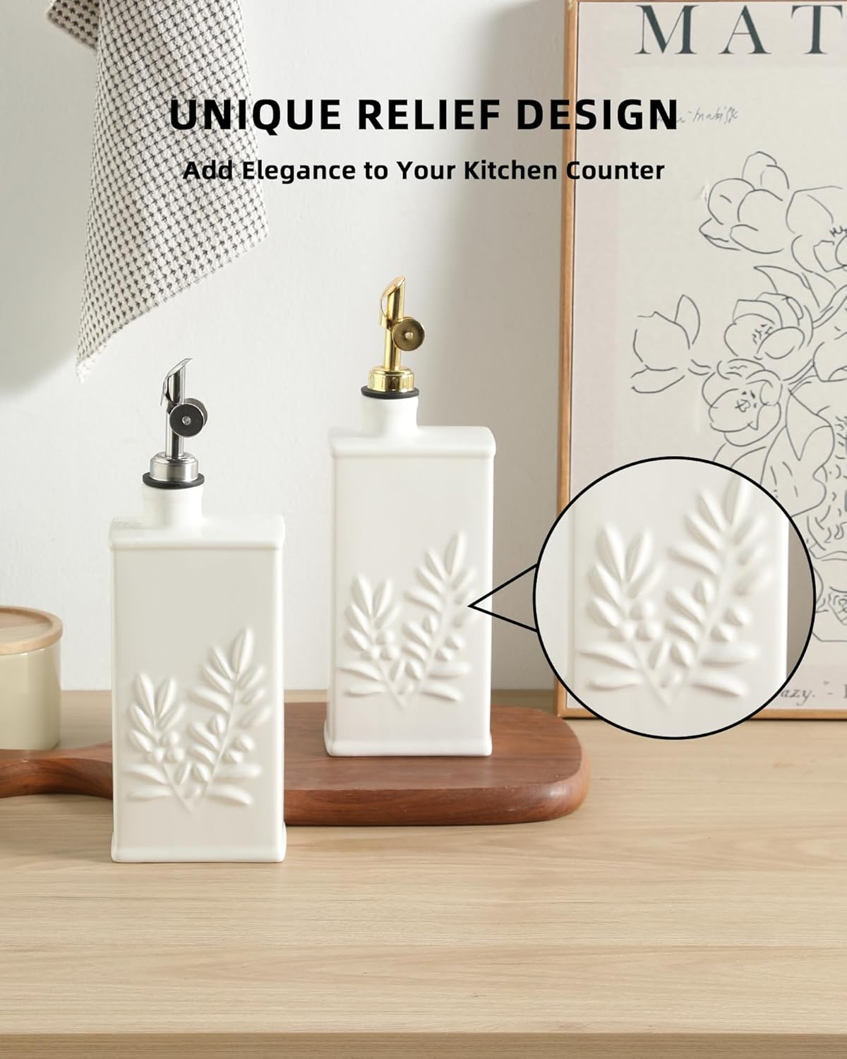 Sweejar Ceramic Olive Oil Dispenser Bottle for Kitchen, 17 Oz Relief Opaque Oil and Vinegar Dispenser Bottle with Spout, Suitable for Soy Sauce, Coffee Syrup, Liquids (White)