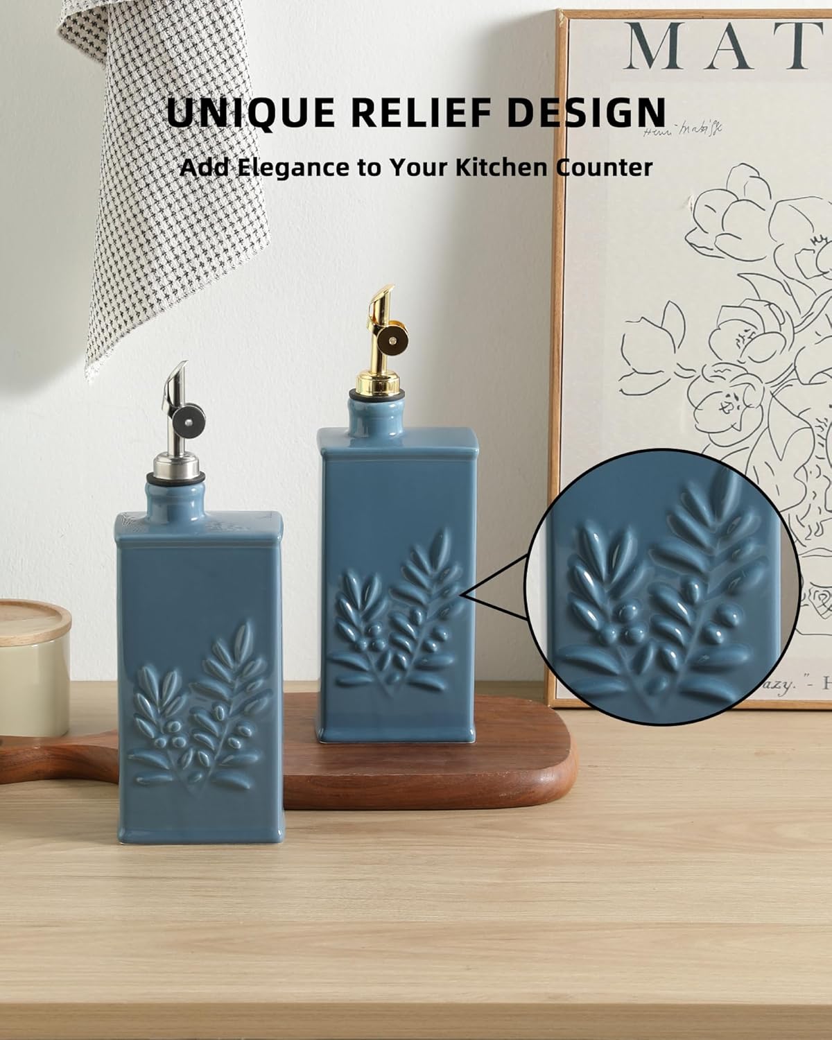 Sweejar Ceramic Olive Oil Dispenser Bottle for Kitchen, 17 Oz Relief Opaque Oil and Vinegar Dispenser Bottle with Spout, Suitable for Soy Sauce, Coffee Syrup, Liquids (Fogblue)