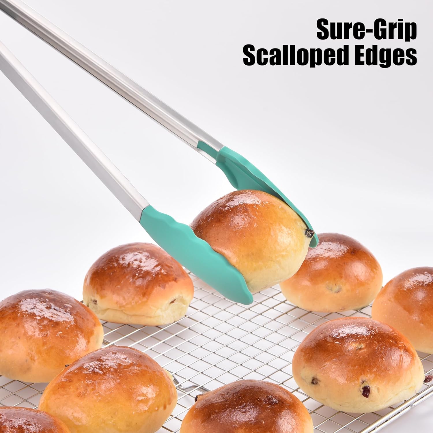 Doosu Kitchen Tongs for Cooking - 600°F Heat Resistant Food Tong with Non-Scratch Silicone Tips, Heavy Duty Stainless Steel Locking Tong for BBQ, Grilling Steak, Serving Salad, Pasta (16in, Aqua Sky)