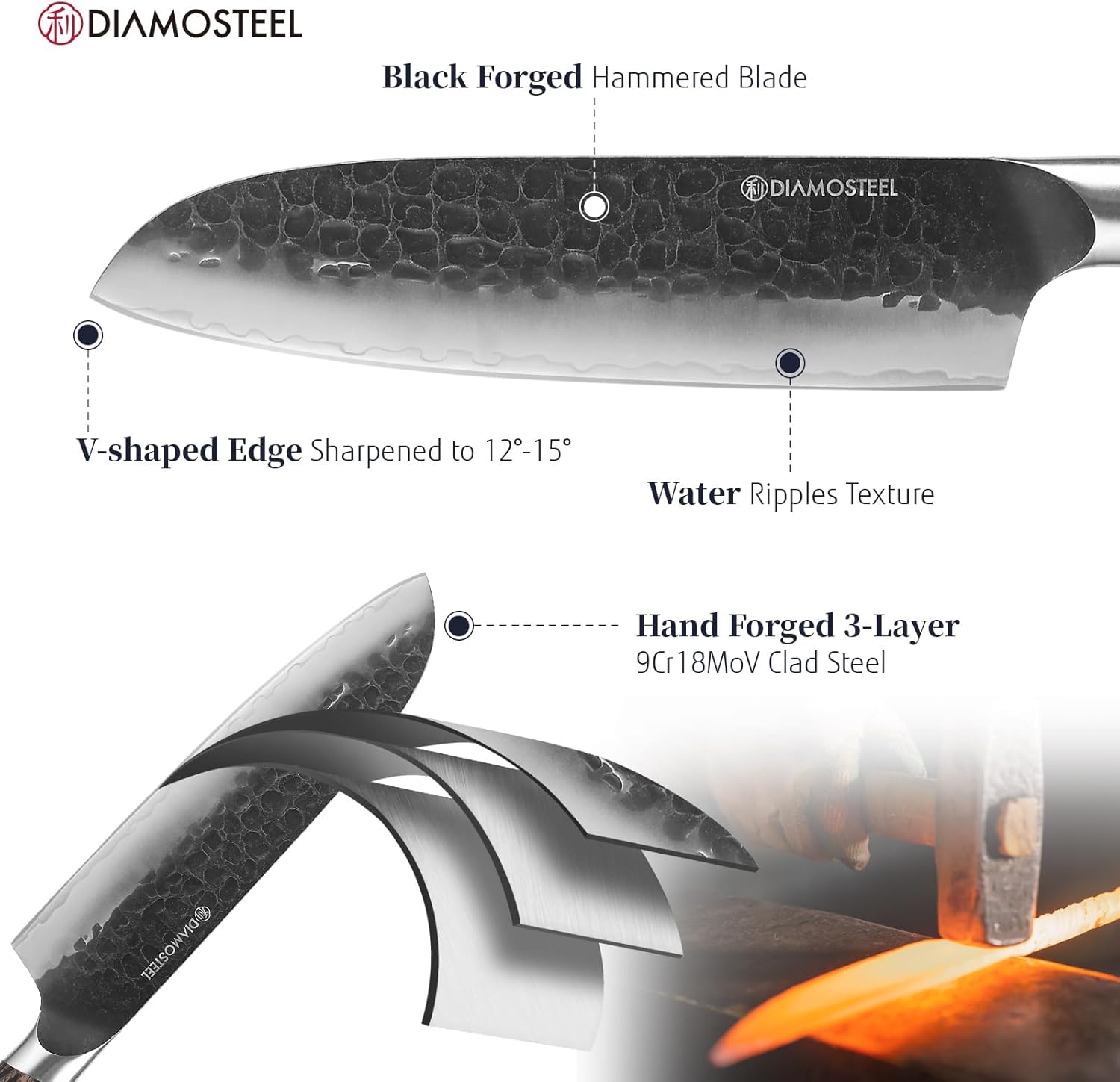 - Premium Triple-Layer Steel Blade - Say goodbye to dull kitchen knives. Our Diamosteel Santoku knife is crafted from high-quality 9CR18MOV three-layer composite steel, boasting a sharp edge honed to 12-15° and a hardness rating of HRC58-60. This ensures superior edge retention and rust resistance, making it your dependable cooking knife for years of precise slicing and dicing.