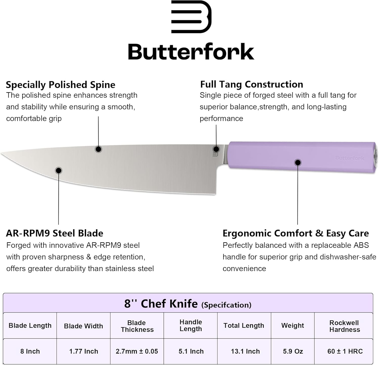 - 【Professional Chef's Knife】- Butterfork 8“ chef knife is made of AR-RPM9 steel and uses a powdering process. The kitchen knife has super high hardness (HRC 60±1), as well as excellent toughness and corrosion resistance, making it an ideal all-purpose kitchen knife