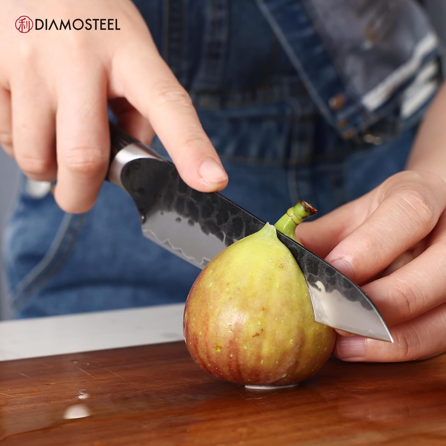 - Premium Triple-Layer Steel Blade - Say goodbye to dull kitchen knives. Our Diamosteel kitchen utility knife is crafted from high-quality 9CR18MOV three-layer composite steel, boasting a sharp edge honed to 12-15° and a hardness rating of HRC58-62. This ensures superior edge retention and rust resistance, making it your dependable cooking knife for years of precise slicing and dicing.