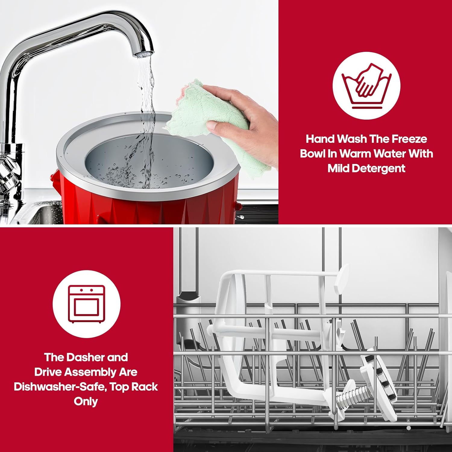 - Included Components : 1 x Dasher (Dishwasher Safe), 1 x Drive Assembly (Dishwasher Safe), 1 x Freeze Bowl (Hand wash), 1 x User Manual 1 x Dasher (Dishwasher Safe), 1 x Drive Assembly (Dishwasher Safe), 1 x Freeze Bowl (Hand wash), 1 x User Manual
