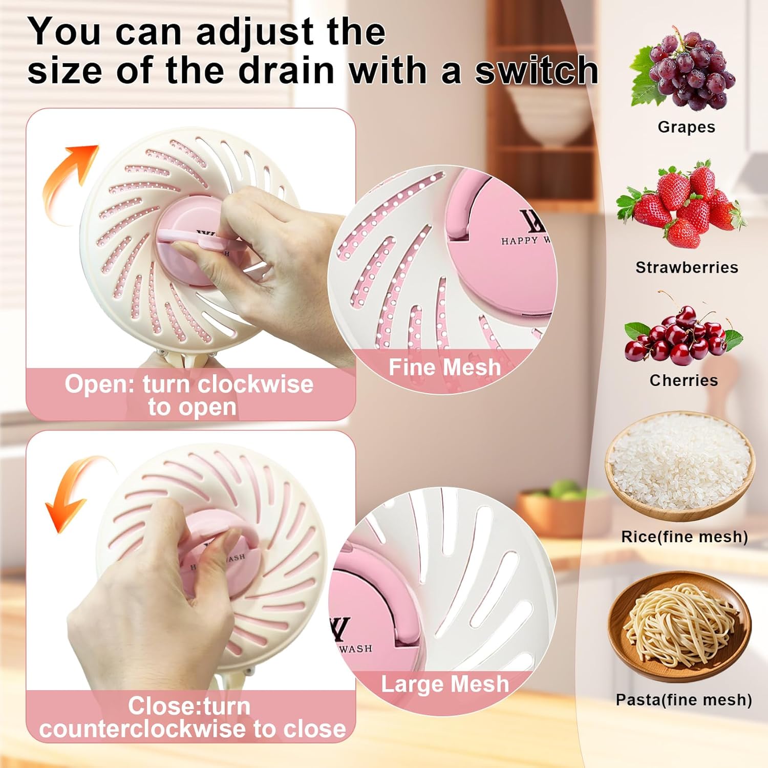 - Upgraded Drainer: Fruit washing bowl features both fine mesh and large slots for draining. Adjust the drainage size with the drain switch to suit your needs. The fine mesh is perfect for smaller fruits, vegetables, rice, and beans.
