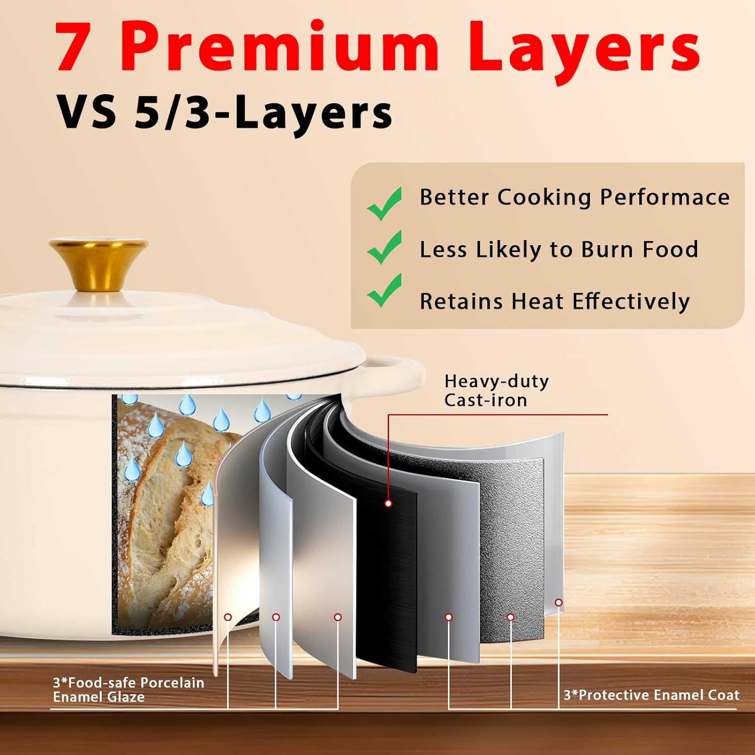 - 7-Layer Superior Construction: Triple-enamel coating + 4-layer cast iron core ensures unparalleled heat retention (30% better than standard Dutch ovens) and chip-resistant durability