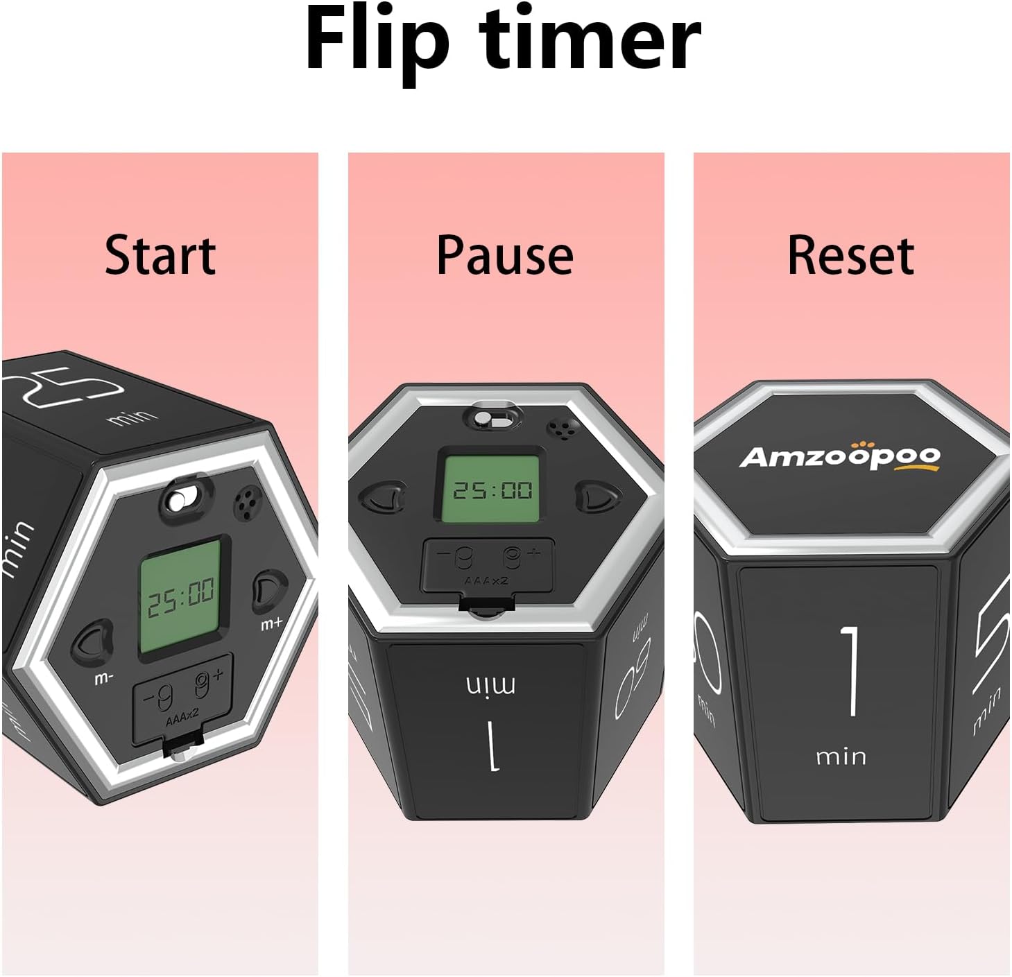 - Amzoopoo Timer: Are you tired of pressing buttons over and over to select minutes? The Amzoopoo kitchen timers will change the game. Just flip to a particular side for pre-set desk timers, done! No need to press button over and over when you need the standard 1, 5, 10, 25, 30, 60 minutes.