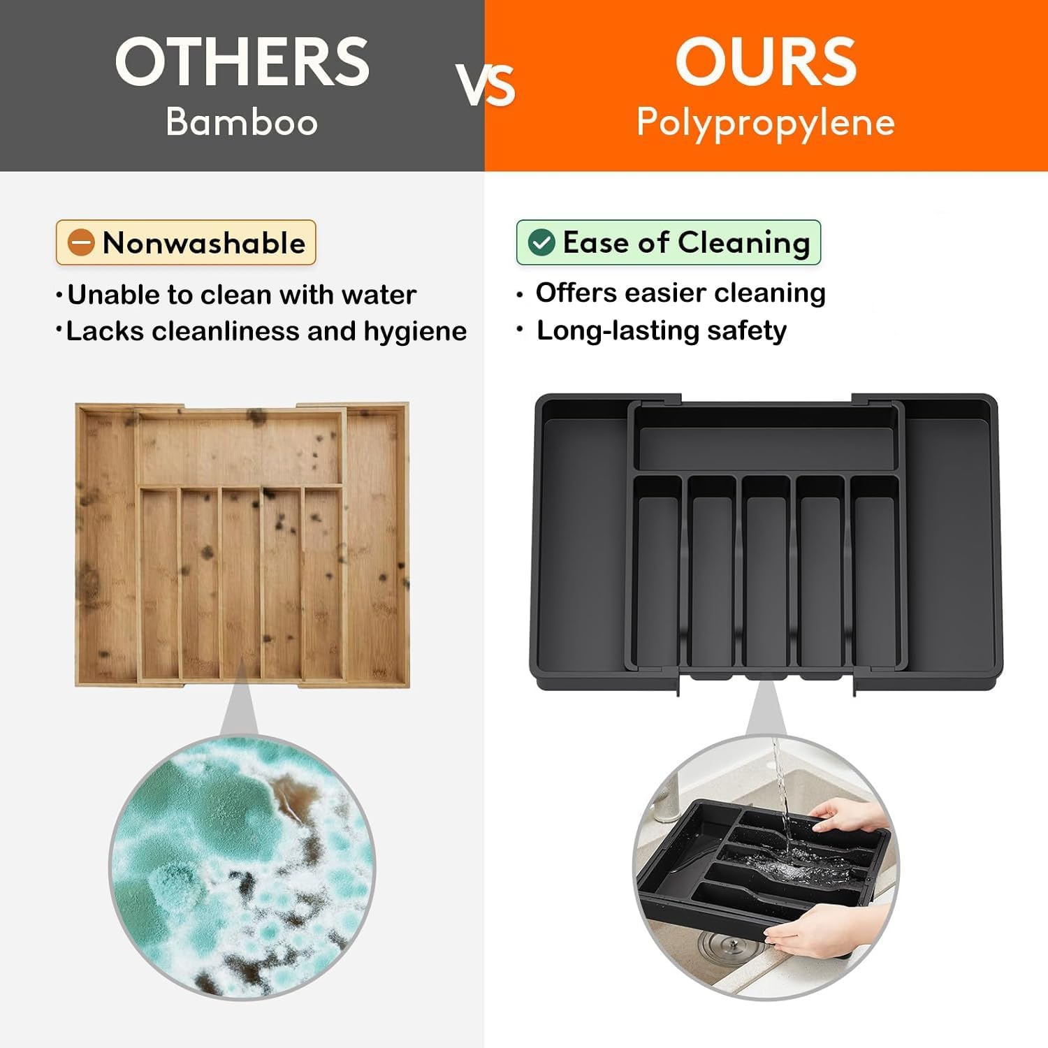 - STURDY and SAFE : The cutlery drawer organizer is made of thick and sturdy food-grade PP material, capable of withstanding daily wear and tear. Additionally, the utensil organizer is BPA-free, ensuring the safety of all types of tableware. Cleaning is a breeze - simply rinse with water to remove any stains