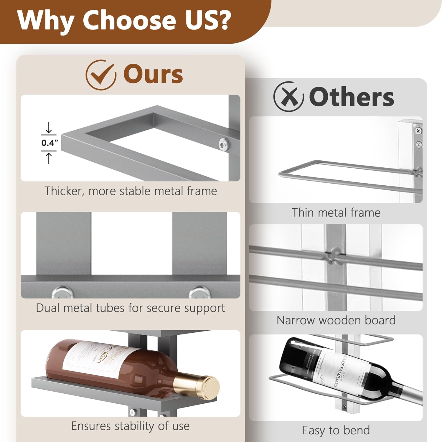 - ăSturdy Structureă With metal and high-strength welding technology, and using multiple screws to fix it to the wall, which makes this wall-mounted wine rack is not easy to bend, enough to firmly fix the wine bottles and can be used for a long time.