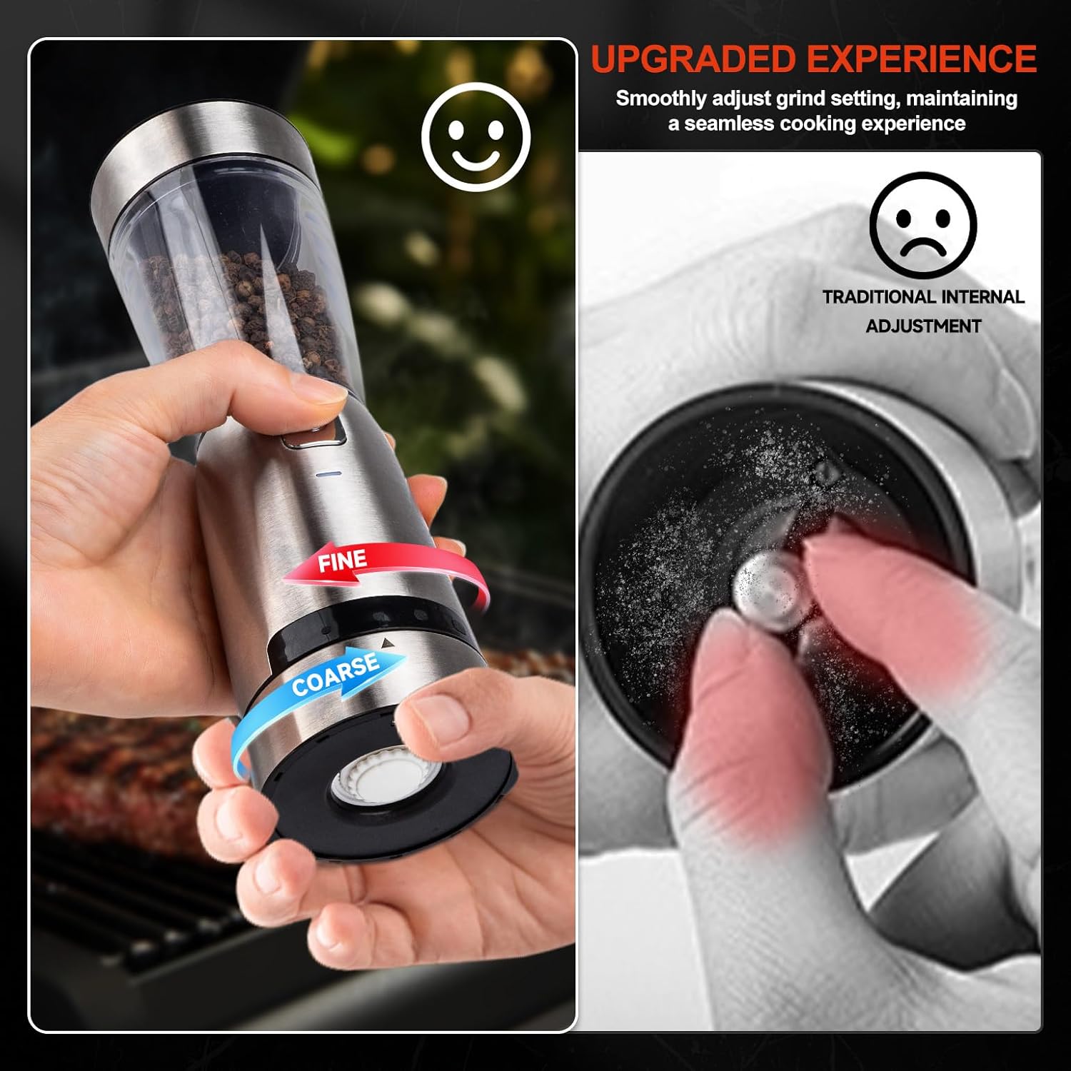 - 【One-handed operation】- Experience effortless cooking with this automatic salt and pepper grinder set, built-in LED lights, with an innovative external roughness adjustment mechanism that allows you to easily dial in the texture you want without touching the pepper. This keeps your hands clean while in use, which is a great choice for a health-conscious chef