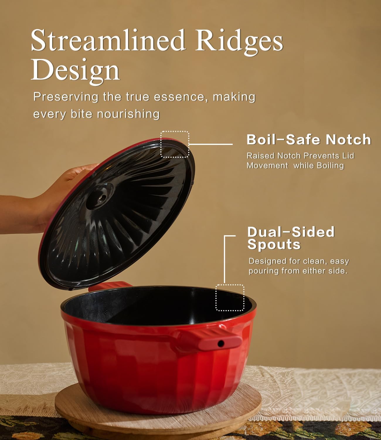 - Thoughtful Design for Everyday Ease: From streamlined ridges that lock in flavor to a raised notch that keeps the lid steady while boiling—every design choice serves a purpose. Dual-sided spouts make pouring easy from either side, and the stay-cool handle with heat cap adds comfort and safety.