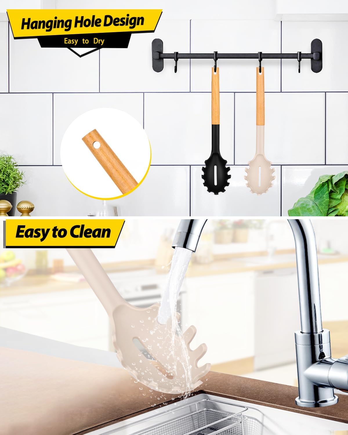 Pack of 2 Spaghetti Spoon, Silicone Pasta Fork with Wooden Handle, Heat Resistant Noodle Spoon Server, BPA Free Spaghetti Strainer(BLACK-KHAKI)