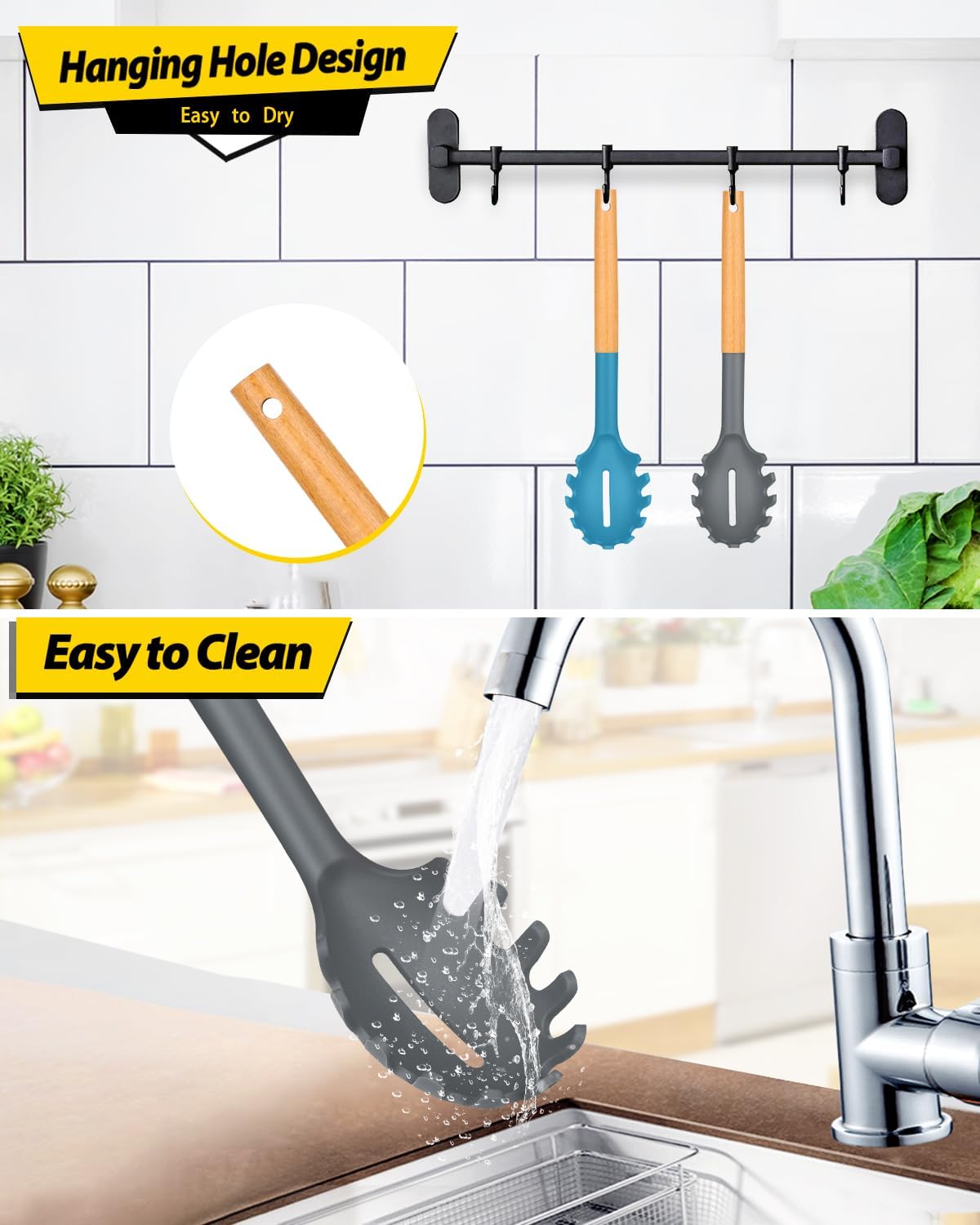 - More Safe and Healthy : Our spaghetti spoons are made of food-grade silicone, free of BPA;Even at high temperatures, there is no need to worry about melting or deforming;And the soft silicone head won't scratch the coating, it can better protect your pot