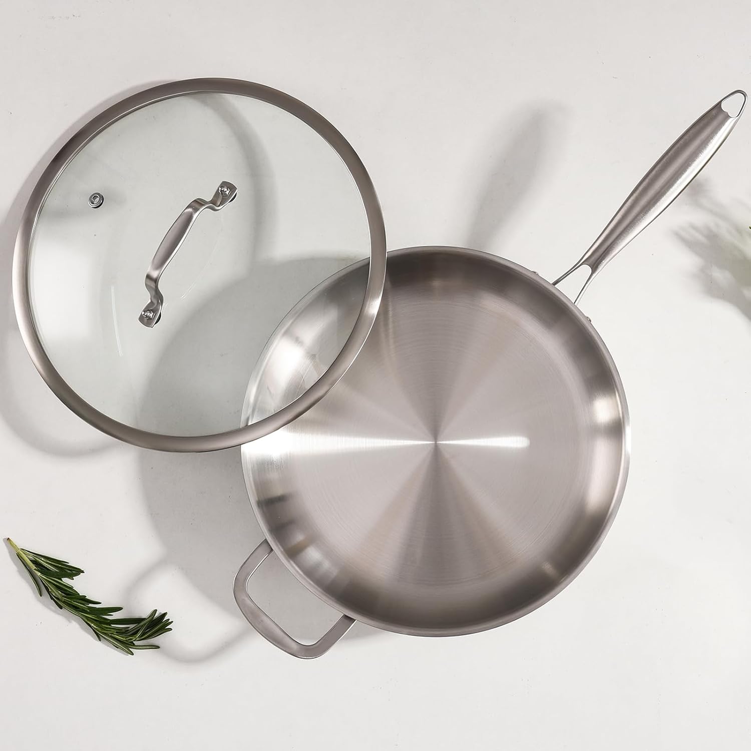 DELARLO Stainless Steel Pan, 14.2 Inch Frying Pan, Tri-Ply Skillet with Lid, Oven Safe Up to 600℉,Stainless Steel Cookware, Fast Even Heat, Large Cooking Surface,Non Toxic Skillet