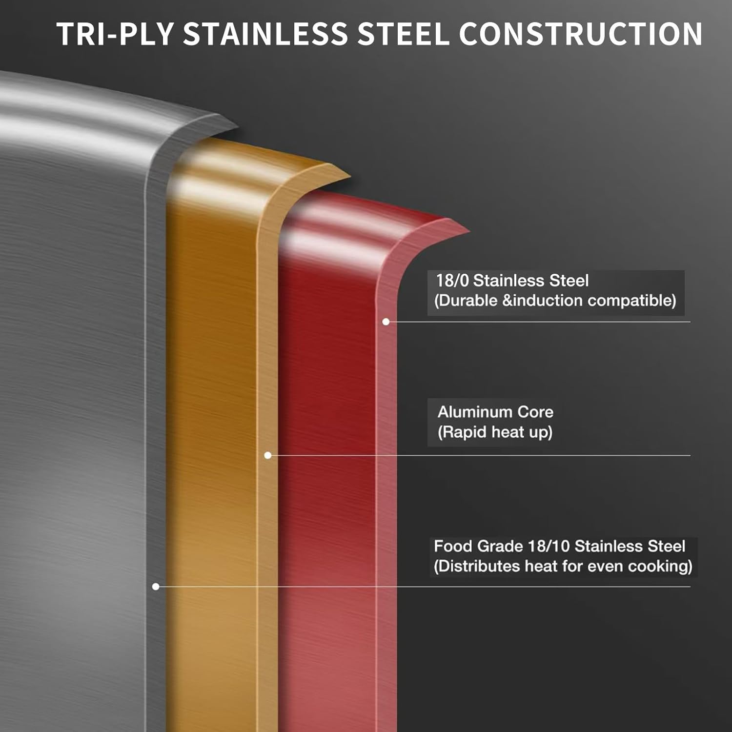 - 【HIGH-QUALITY STAINLESS STEEL 】DELARLO Tri-Ply Stainless Steel Pan Efficient Allows Heat to Pass Through the Entire Pan Fast. Please Do Not Heat the Empty Cooker. Suggest Cooking with Medium-Low Heat