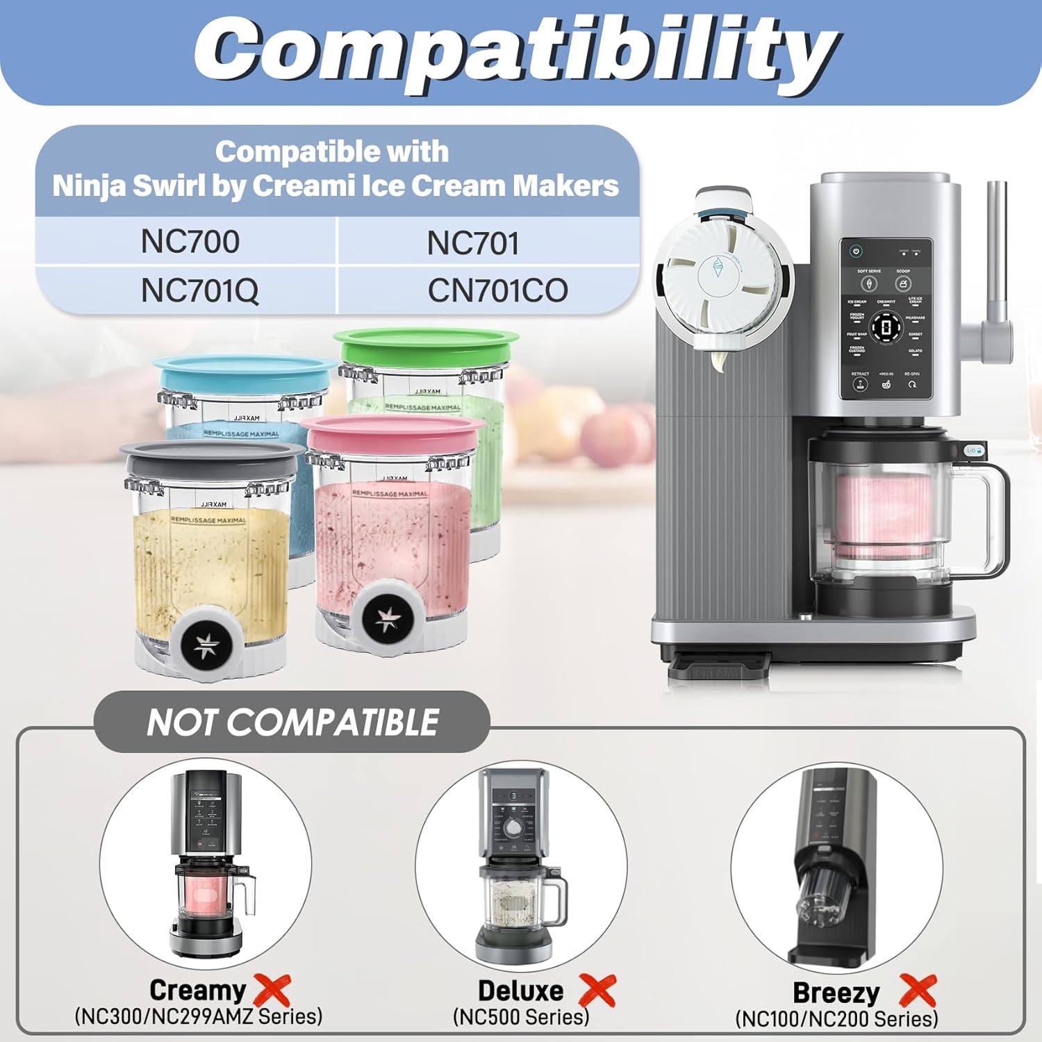 - 【COMPATIBILITY】- These pints and lids replacement for Ninja are ONLY compatible with Ninja Swirl by Creami Ice Cream and Soft Serve Makers, including NC700, NC701, NC701Q and CN701CO. Please note that they are NOT COMPATIBLE with Ninja Creami (NC299AMZ/NC300 Series), Deluxe (NC500 Series) or Breeze (NC100/200 Series) Ice Cream Makers.