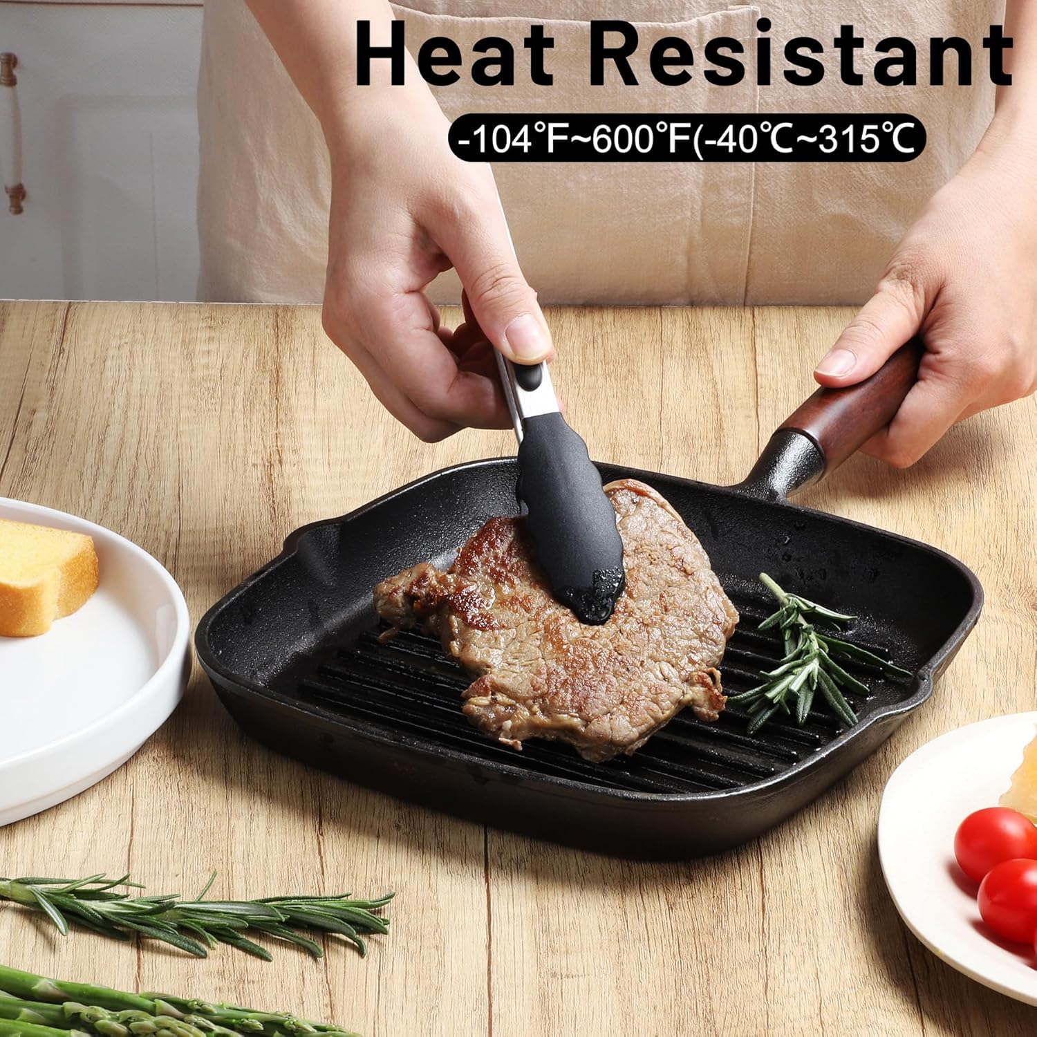 - EASY TO USE: The cooking tongs' handle is cushioned with silicon, good for thumb rest and ensures good grip and control. The Food Grade silicon tongs tip is heat resistance 600°F and less prone to scratch the pan. Easy to rinse, dishwasher safe.