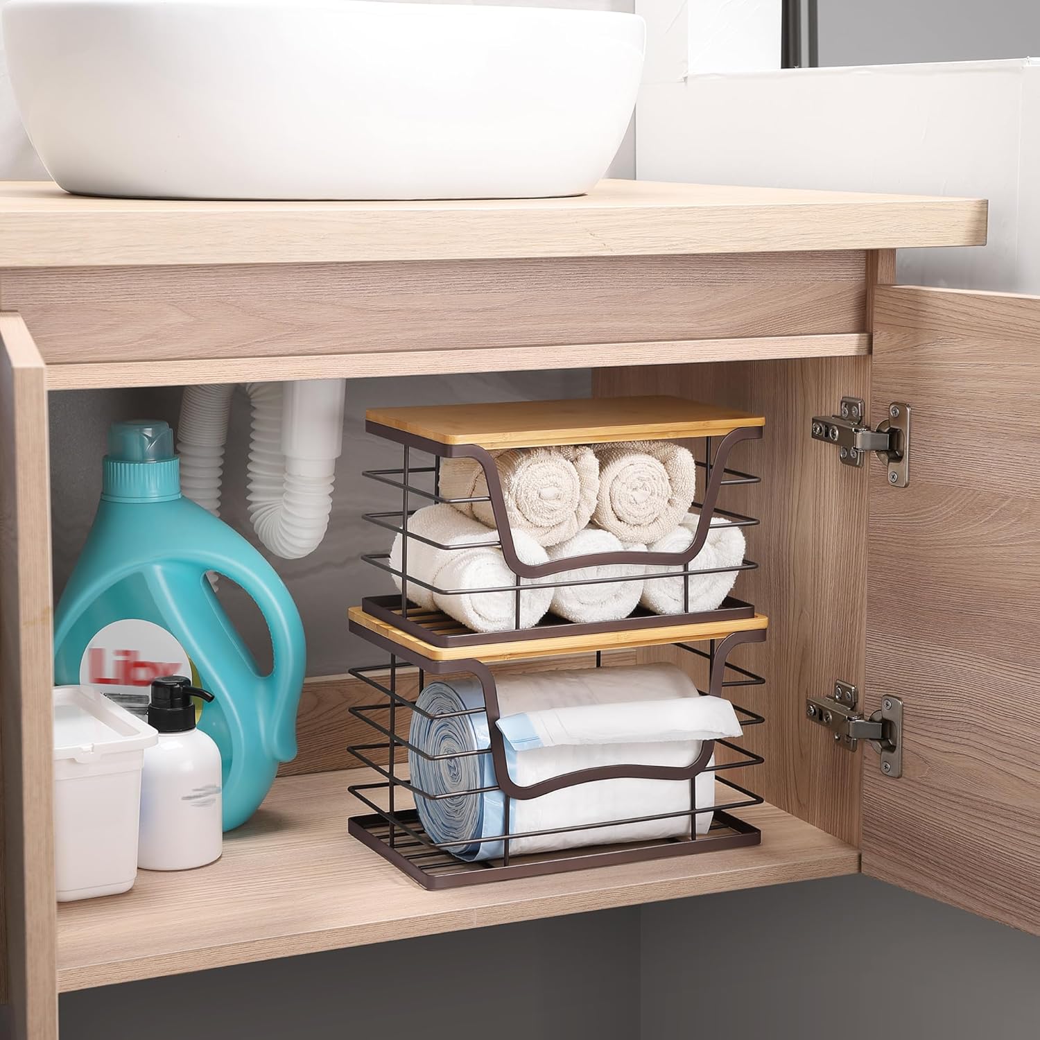 - Easy to Use & Extra Storage. Both dispensers feature wide openings for quick and easy trash bag access. The removable bamboo lids double as shelves for extra storage, allowing you to clearly see and easily reach the items inside—no assembly required, making organization effortless.
