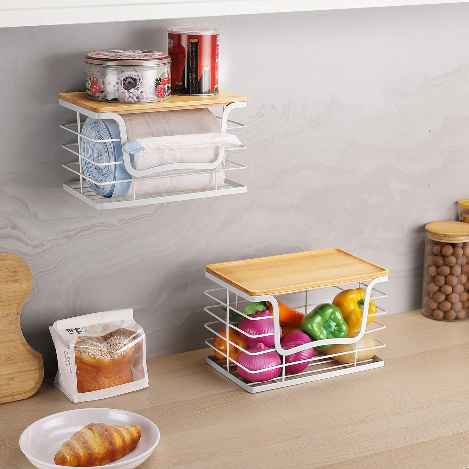Trash Bag Dispenser Holder for Kitchen 2 Pack White Garbage Bag Organizer Wall Mount Stackable Bin with Bamboo Lid for Countertop, Under Sink, Laundry Room