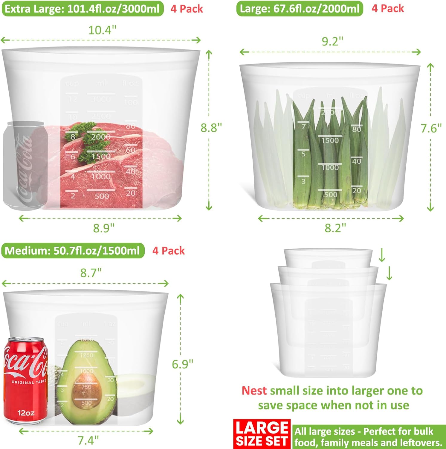 - ăLARGE-SIZE SET & ECONOMICALăYouâll receive 4 Extra Large (0.8gallon/ 101fl.oz/ 3000ml), 4 Large (half gallon/ 67.6fl.oz/ 2000 ml) and 4 Medium (50.7fl.oz/ 1500ml) reusable bags. The ALL large-size set perfect for bulk food, family meals and leftovers. Each bag features volume markings(cup/fl.oz/ml) for easy measurement. The translucent design helps identify contents, and each bag can replace 300+ single-use plastic bags a year, promoting a waste-free world