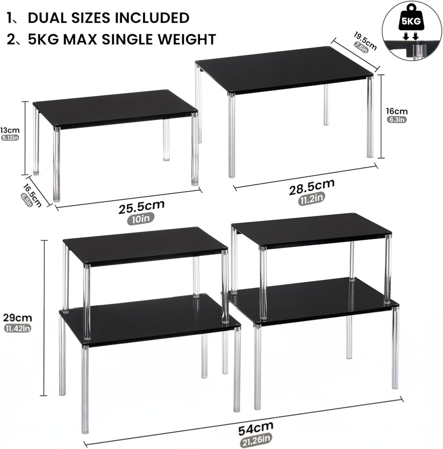 - Stackable & Expandable | Customizable Storage System This stackable organizer set includes two versatile sizes (Large: 28.5x19.5x16cm, Small: 25.5x16.5x13cm), giving you exceptional flexibility to customize your storage. Use them separately as individual table shelves or stack them vertically to create a custom tiered display stand. Each tier supports up to 5kg (11 lbs), securely holding everything from makeup and skincare to books and spices. It's an ideal medicine cabinet organizer and a must-have for pantry organization