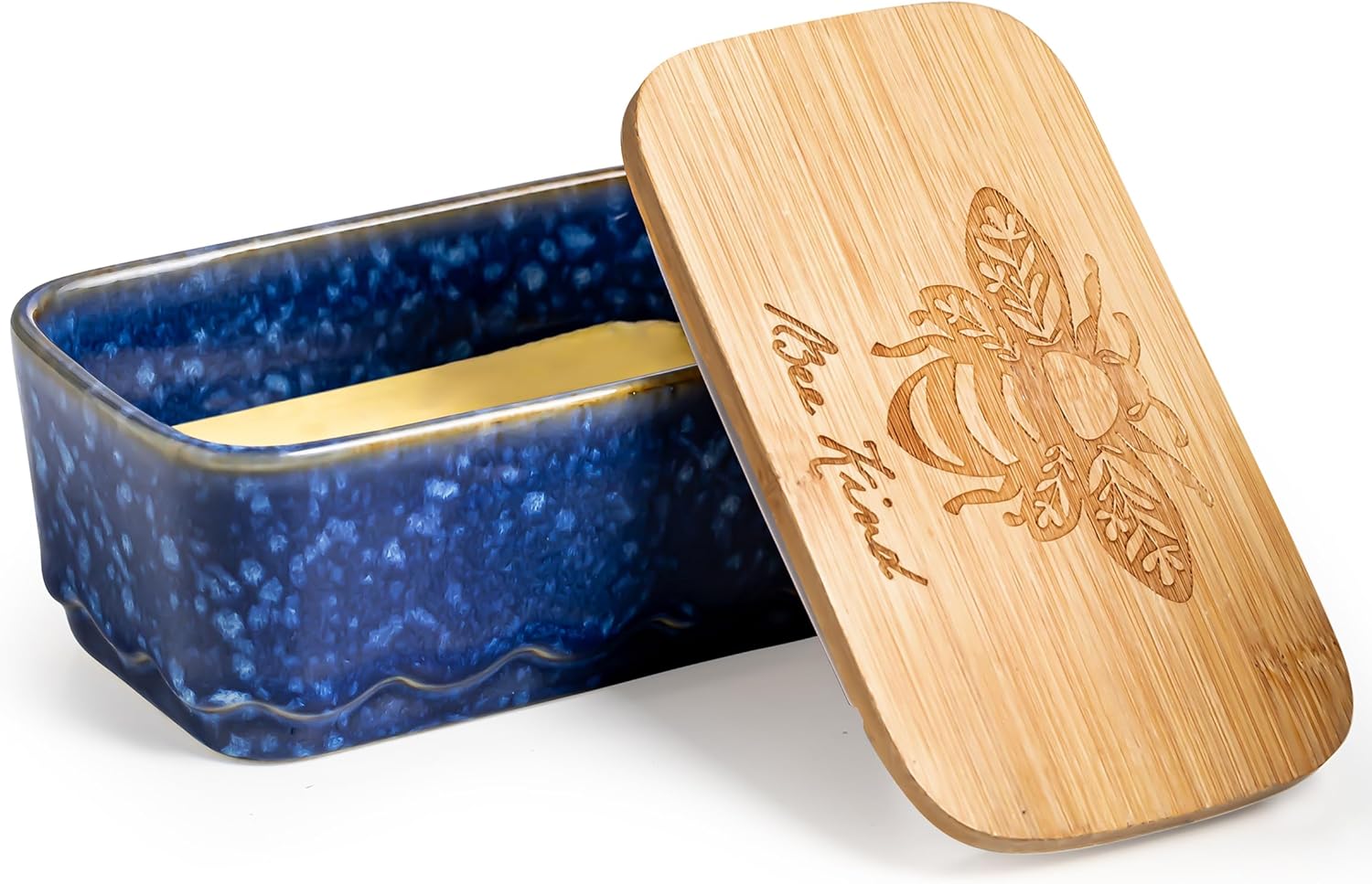 - Enhance Your Kitchen Decor: Add a farmhouse touch to your kitchen with this ceramic butter dish with lid. Available in 4 stylish colors, the honeybee pattern on the wooden lid and wave design complement any kitchen decor.