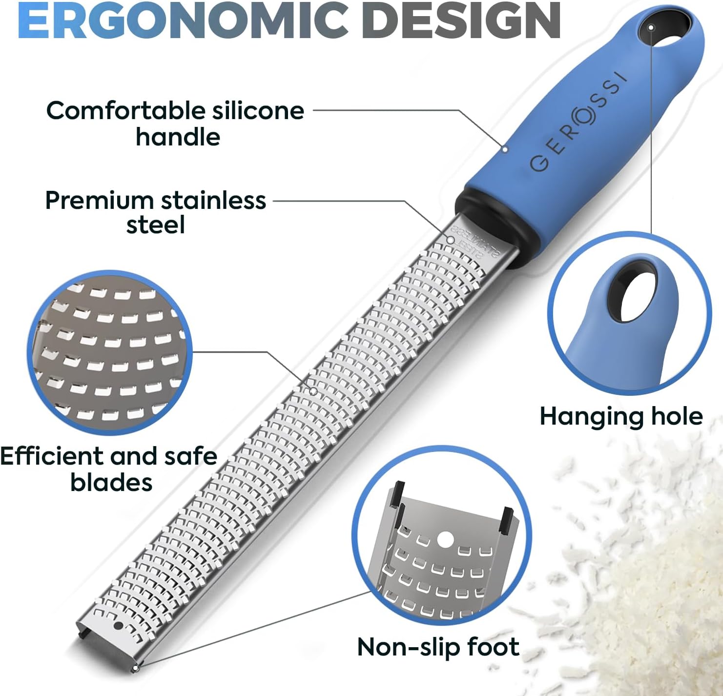 - ZESTER GRATER - Comfortable, non-slip handle. This ginger grater comes with a soft rubber handle, which is designed to give you a better grip. Shred as many ingredients for your recipes without straining your hands.